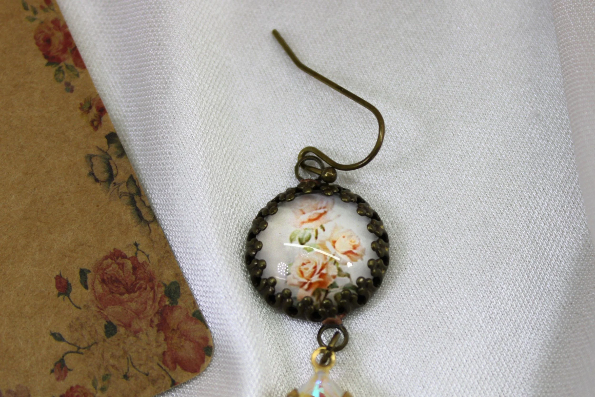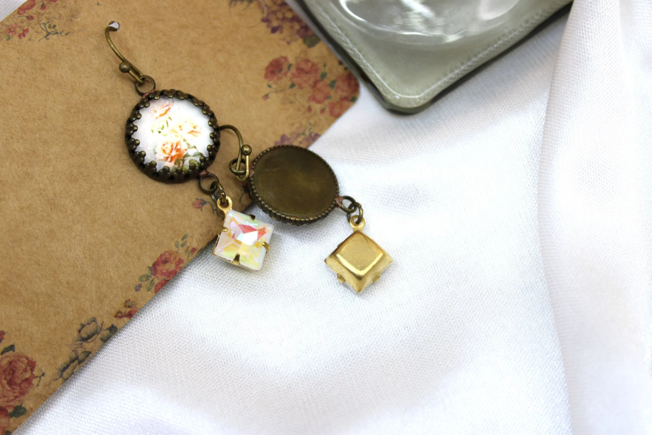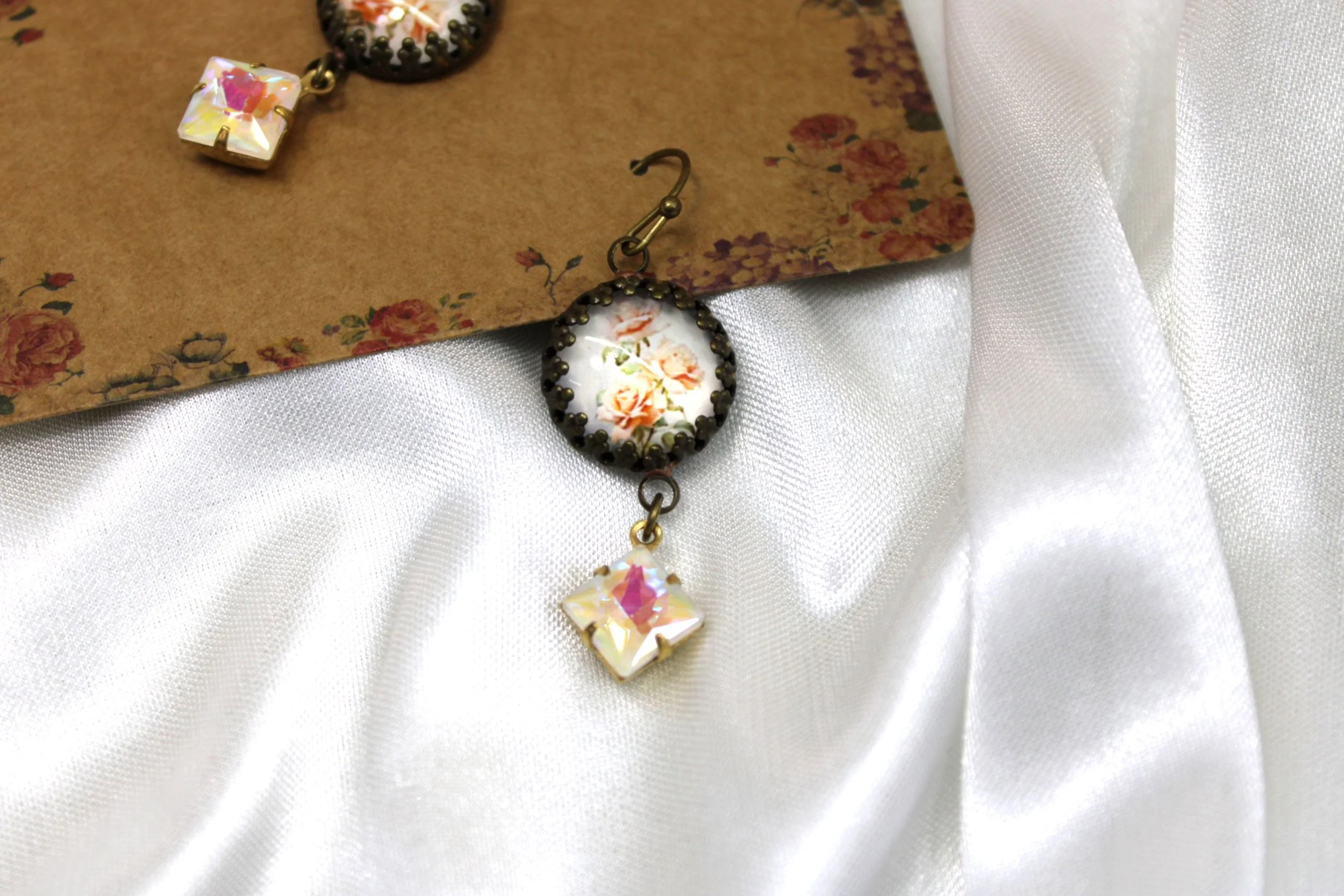 These stunning drop earrings showcase adorable round Hummingbird cabochon charms, elegantly complemented by iridescent glass stone drops. The earrings feature detailed bronze-plated zinc alloy round charms with a Hummingbird and flower pattern, paired with Dijon-coloured, cushioned iridescent glass stone connectors set in gold-toned, raw brass pronged settings. The earrings feature bold 24K champagne gold-plated brass hypoallergenic solid fishhook ear wires. Both the hooks and charms are hypoallergenic and free from lead and nickel, making them ideal for sensitive ears and suitable for pierced ears. Additionally, these earrings are lightweight and comfortable to wear.