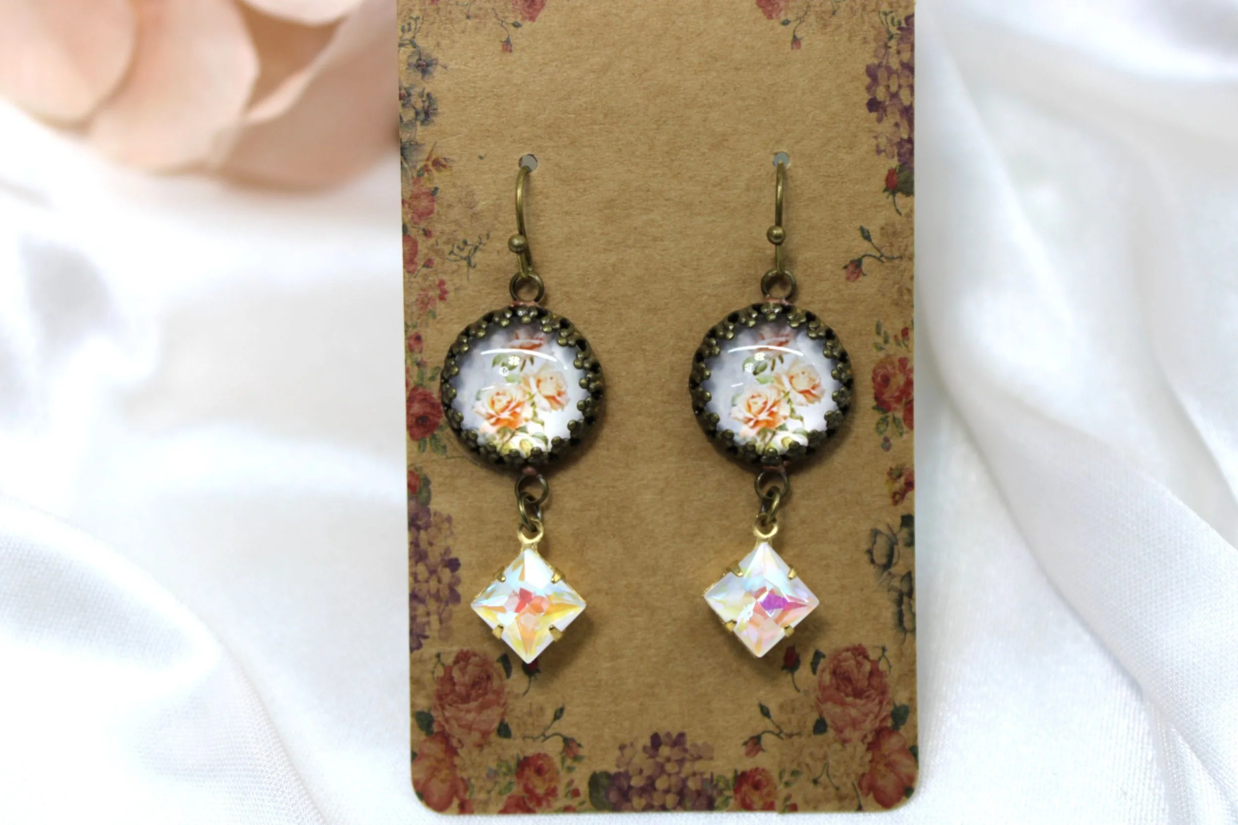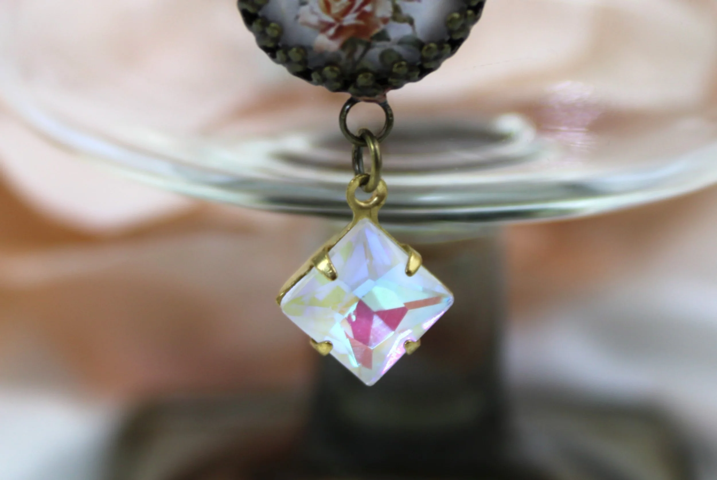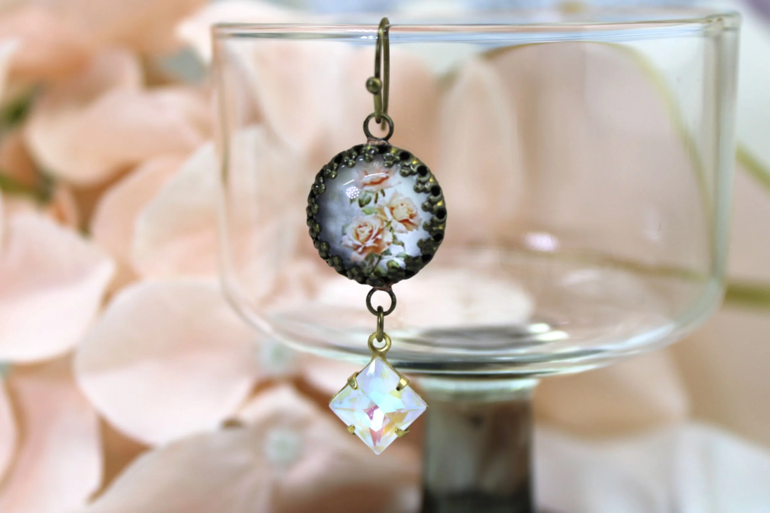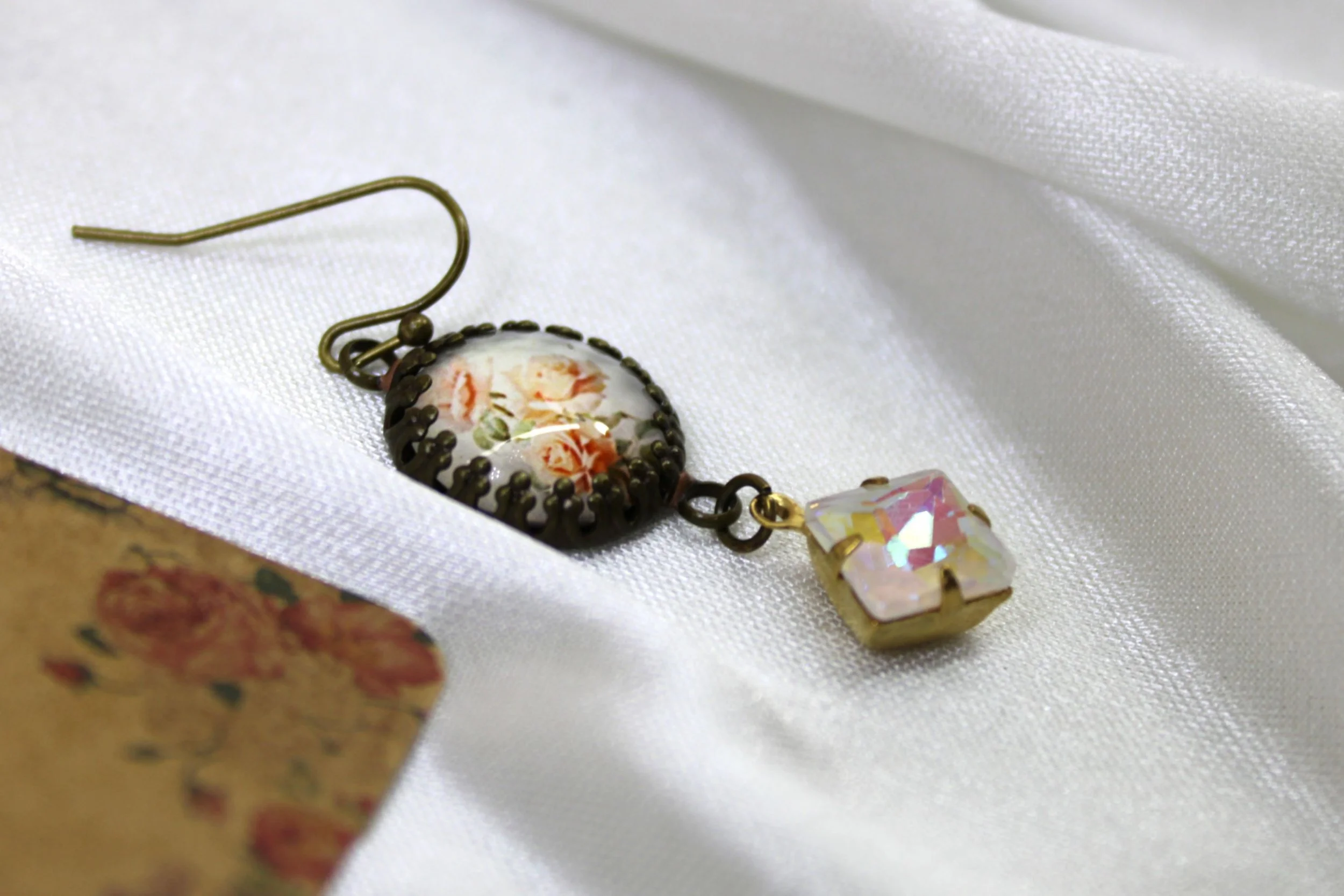 These stunning drop earrings showcase adorable round Hummingbird cabochon charms, elegantly complemented by iridescent glass stone drops. The earrings feature detailed bronze-plated zinc alloy round charms with a Hummingbird and flower pattern, paired with Dijon-coloured, cushioned iridescent glass stone connectors set in gold-toned, raw brass pronged settings. The earrings feature bold 24K champagne gold-plated brass hypoallergenic solid fishhook ear wires. Both the hooks and charms are hypoallergenic and free from lead and nickel, making them ideal for sensitive ears and suitable for pierced ears. Additionally, these earrings are lightweight and comfortable to wear.