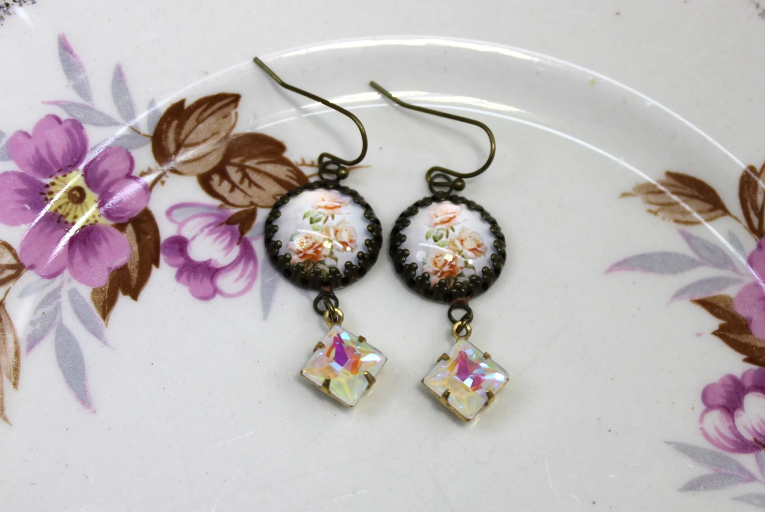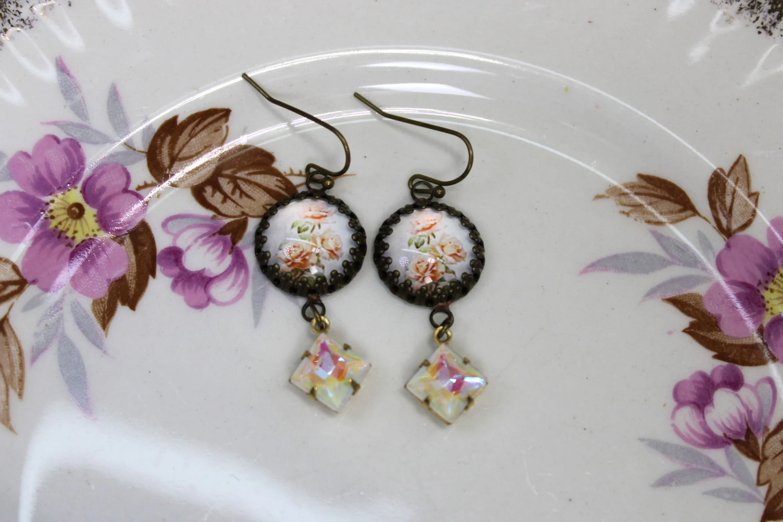 Handcrafted Bronze Plated 24K Earrings With Hummingbird Charms and Glass Stones Old New.