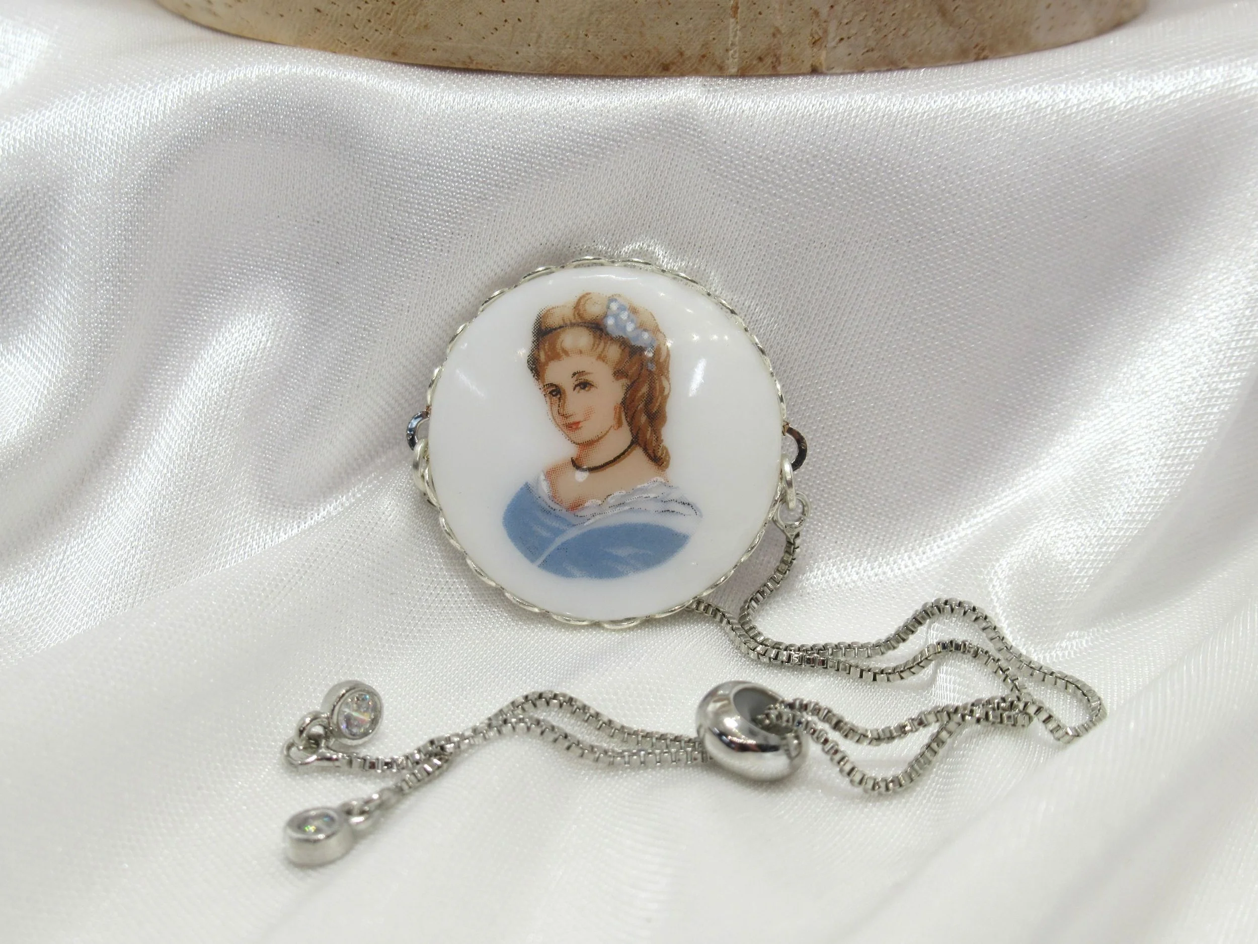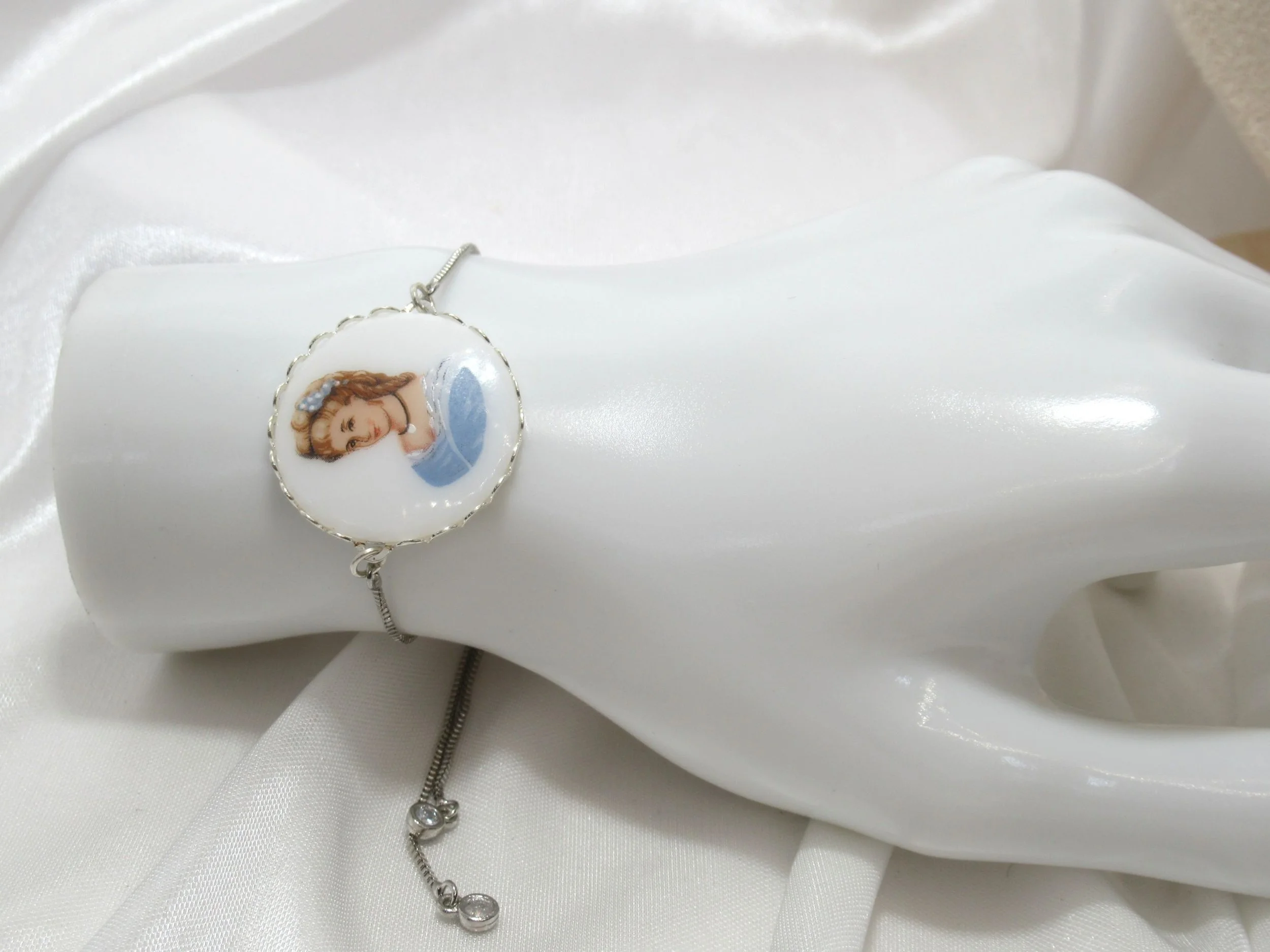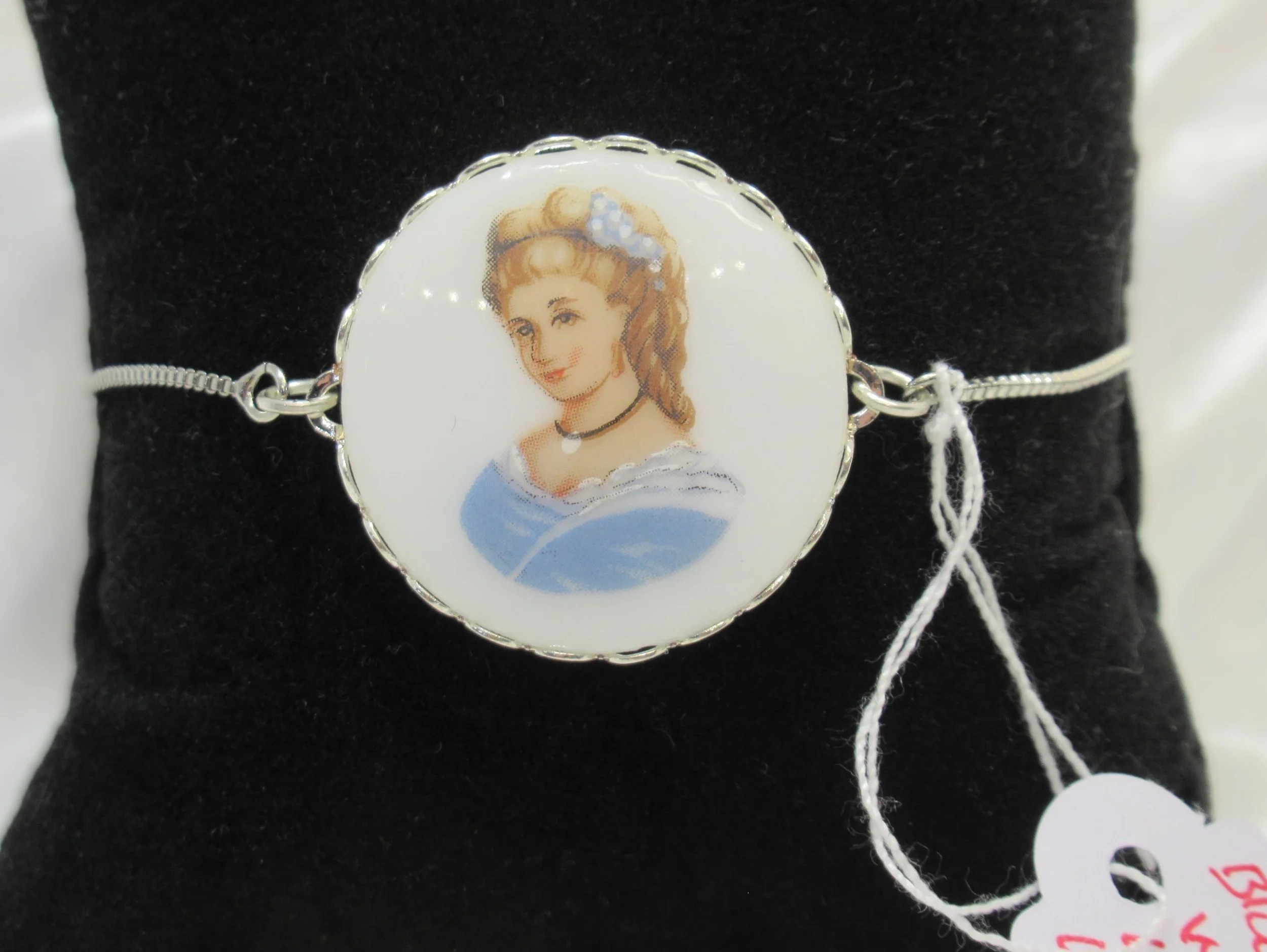 These distinctive cuff bracelets feature a bold, handcrafted design showcasing a vintage 1950s round glass Limoges porcelain cabochon cameo in a 24K gold-plated setting. There are two lovely options to choose from: a pretty red rose flower bouquet or a delicate yellow rose bud. Each cabochon is set into a high-quality 24K gold-plated brass zinc alloy adjustable cuff bangle with a thick, solid decorative hammered pattern on the wristband and a shiny finish. The bracelet cuff is sourced from Turkey, while the vintage cabochon originates from Japan.