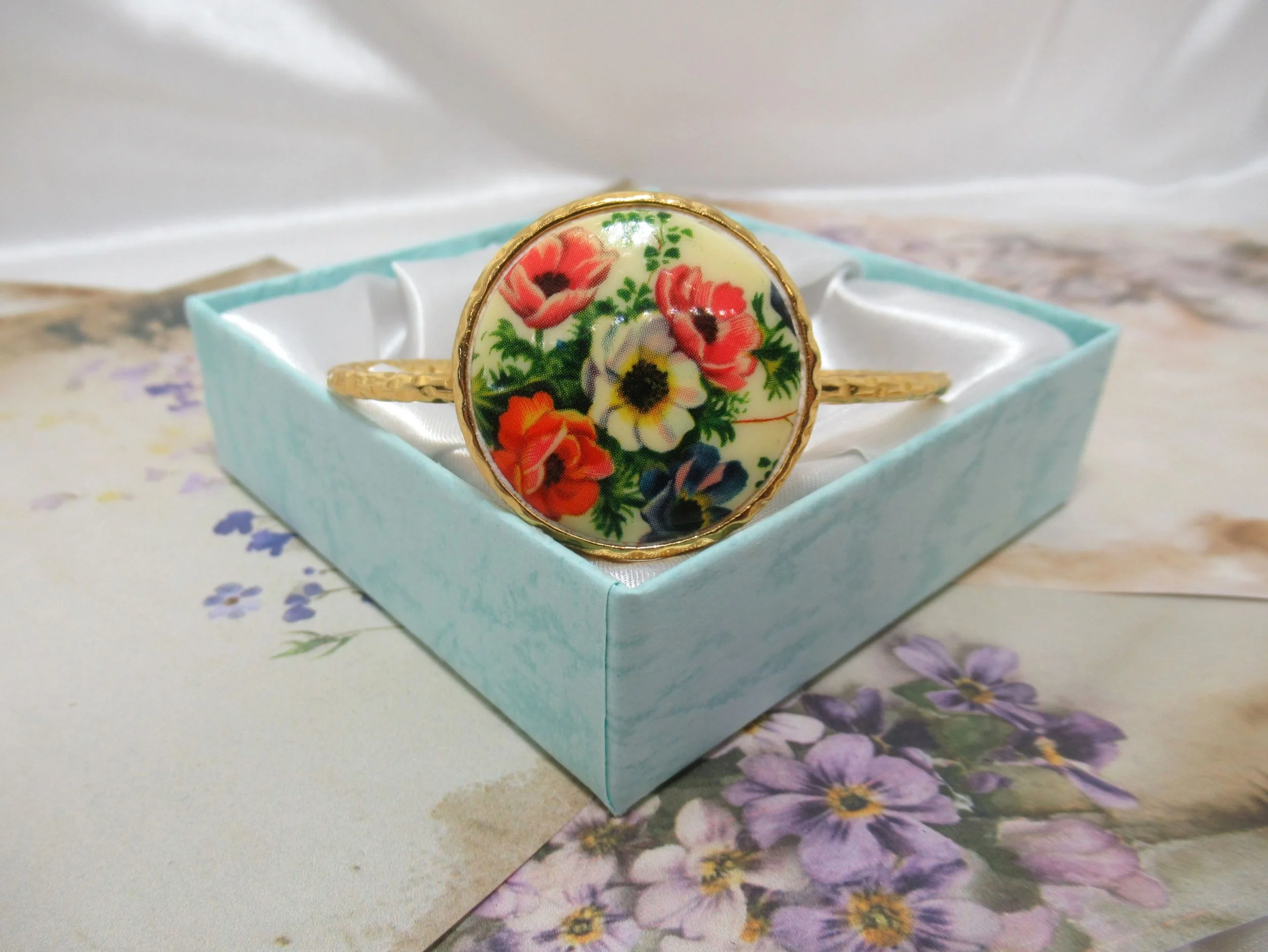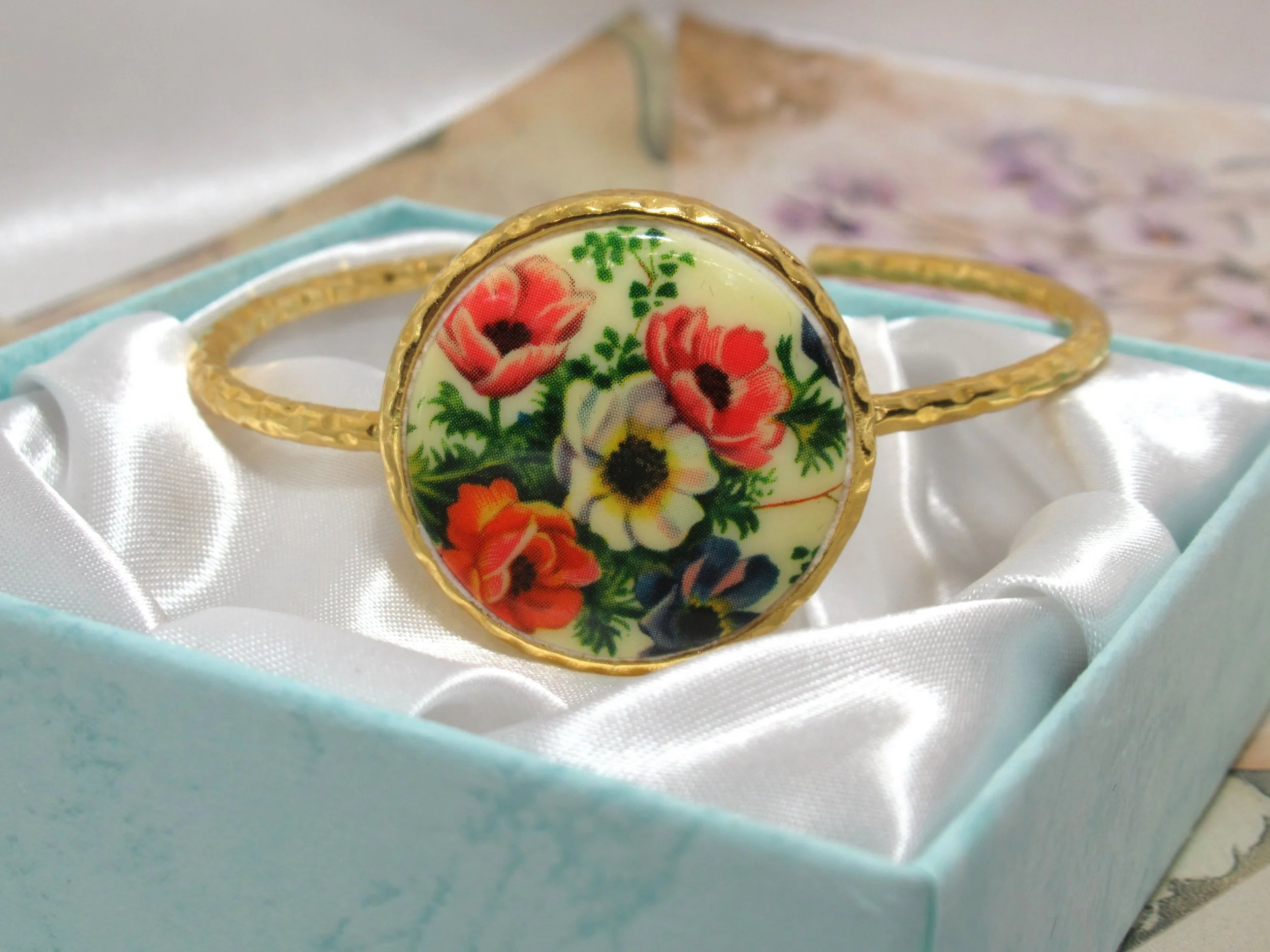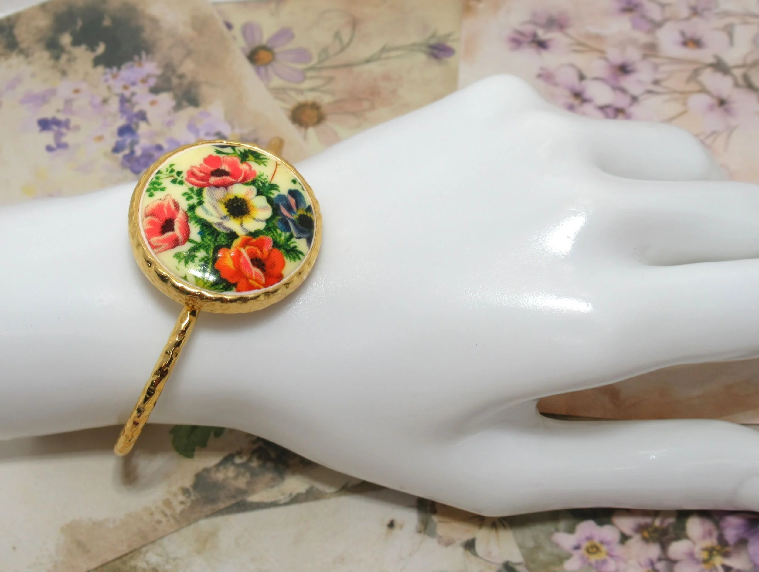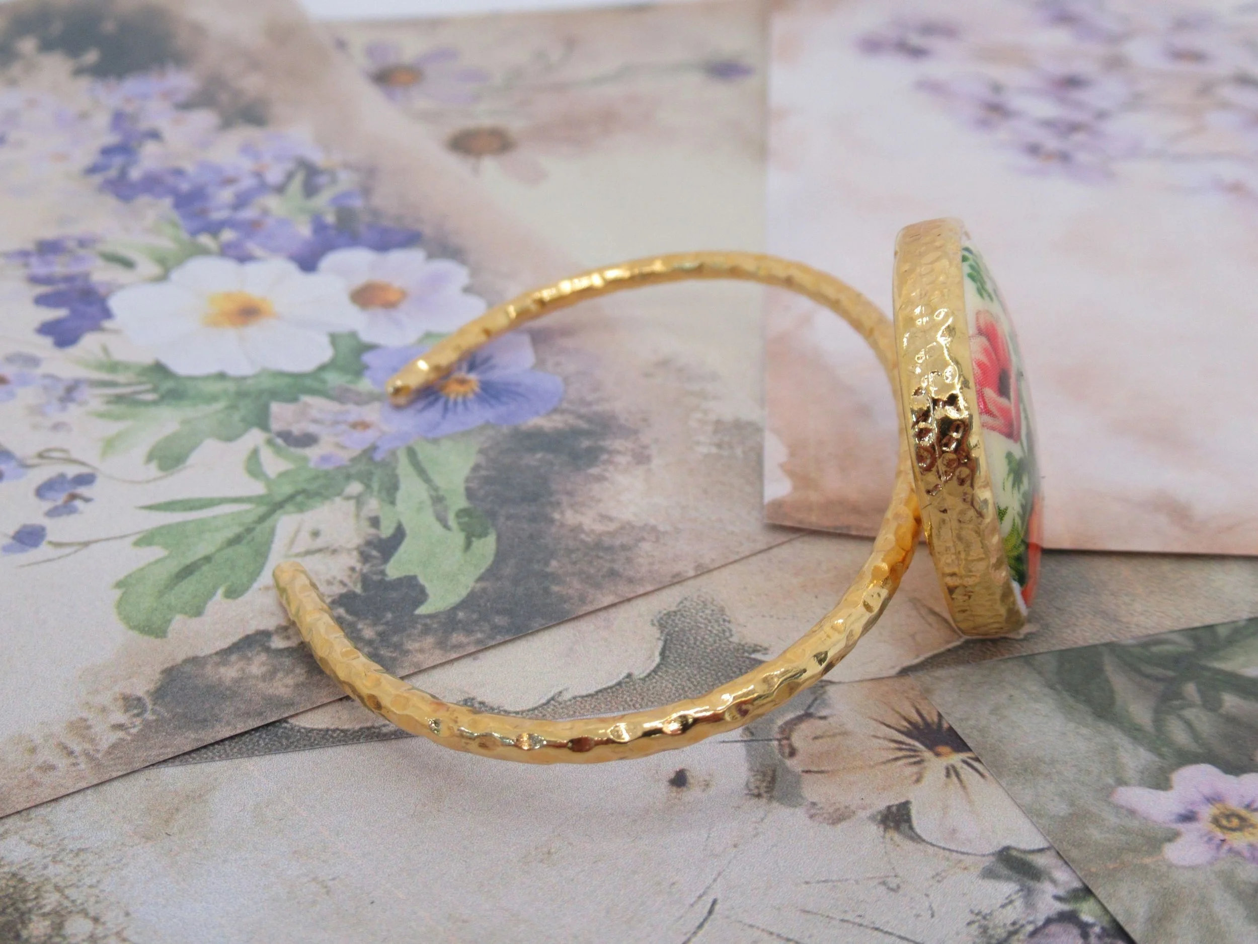 This distinctive bracelet cuff features a bold, handcrafted design that displays a vintage 1950s Limoges porcelain glass cabochon. The cabochon shows a charming red rose flower bouquet pattern, set into a high-quality lead and nickel-free silver-plated brass cup bezel and cuff bangle. The bangle has a Sinburst Sumflower design with intricate, detailed leaf design and a smooth silver cuff. The silver is sourced from Turkey and has a beautiful antique silver colour oxidised finish, while the vintage cabochon originates from Japan.