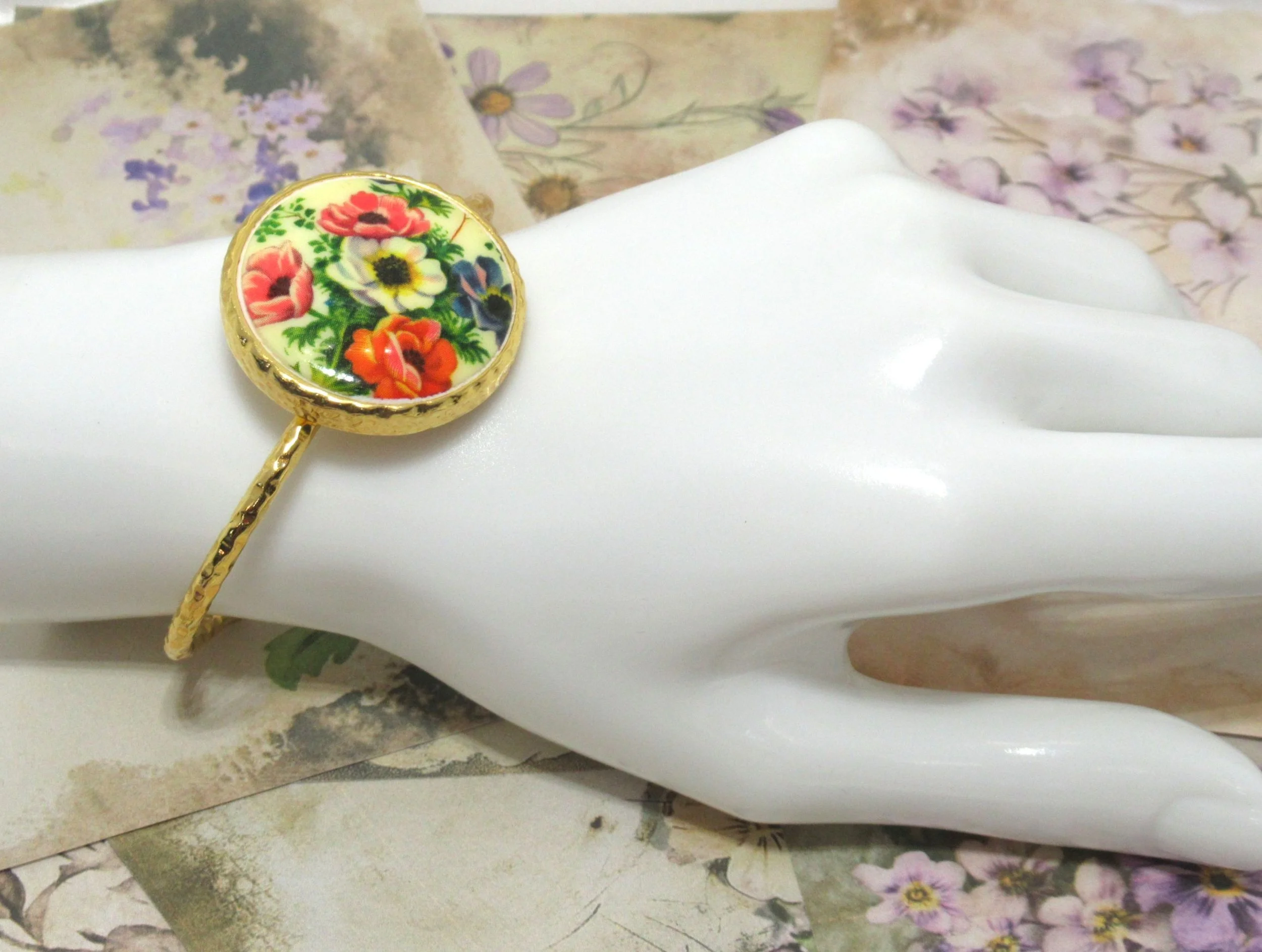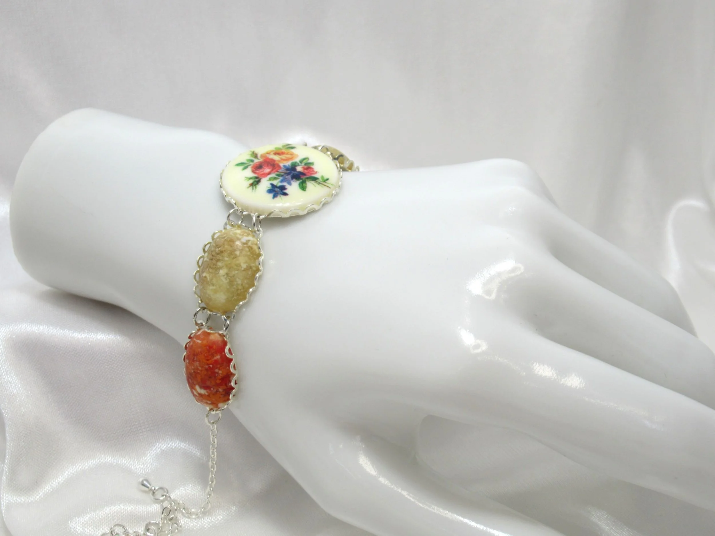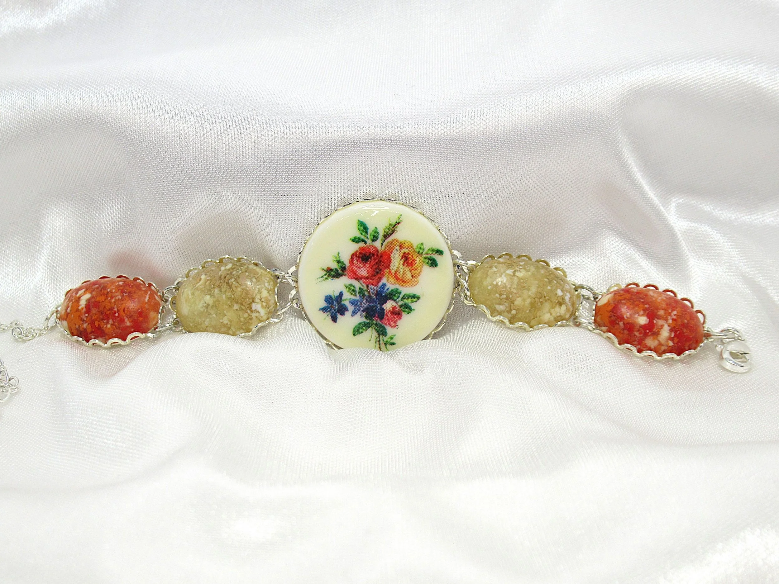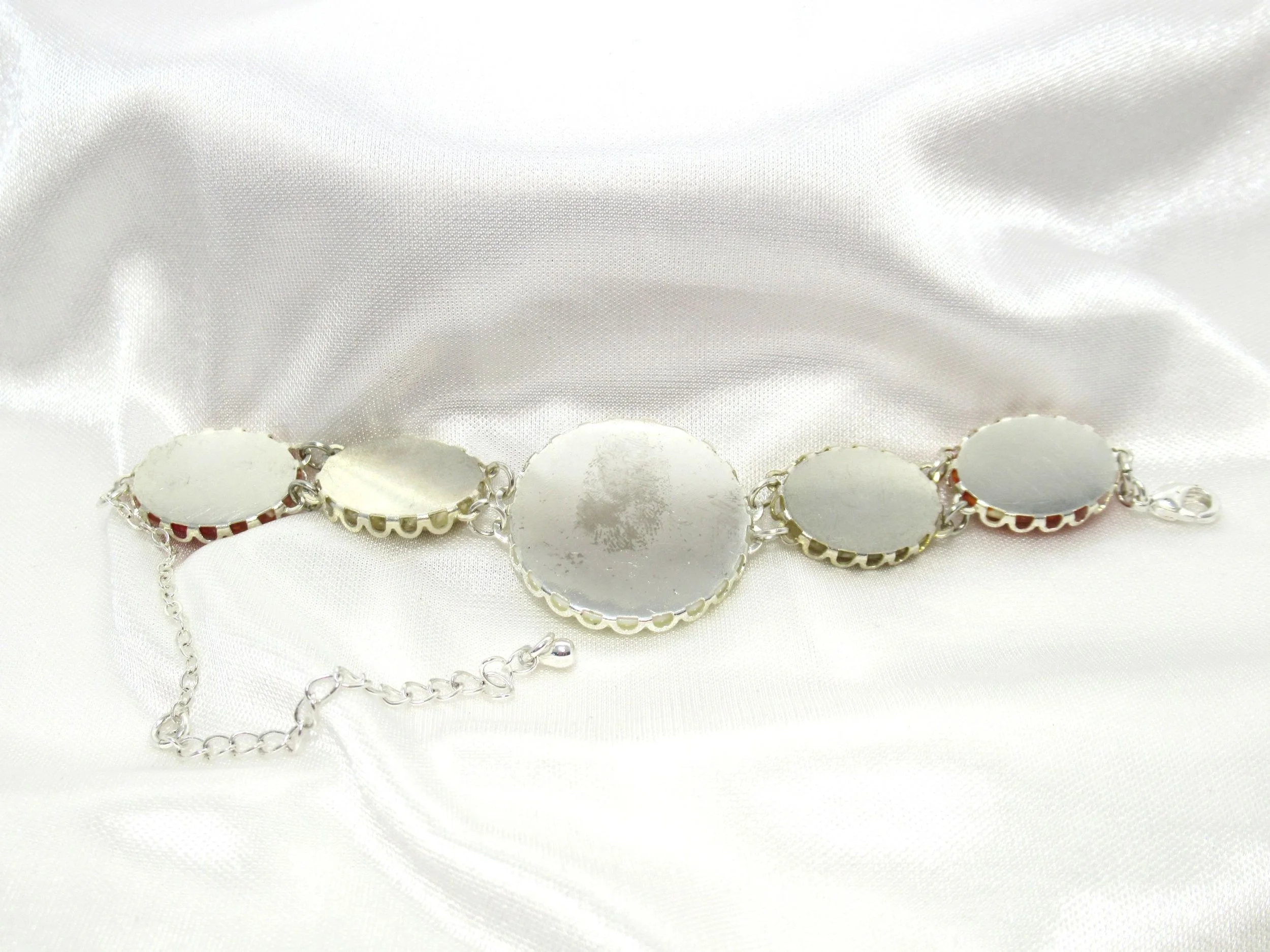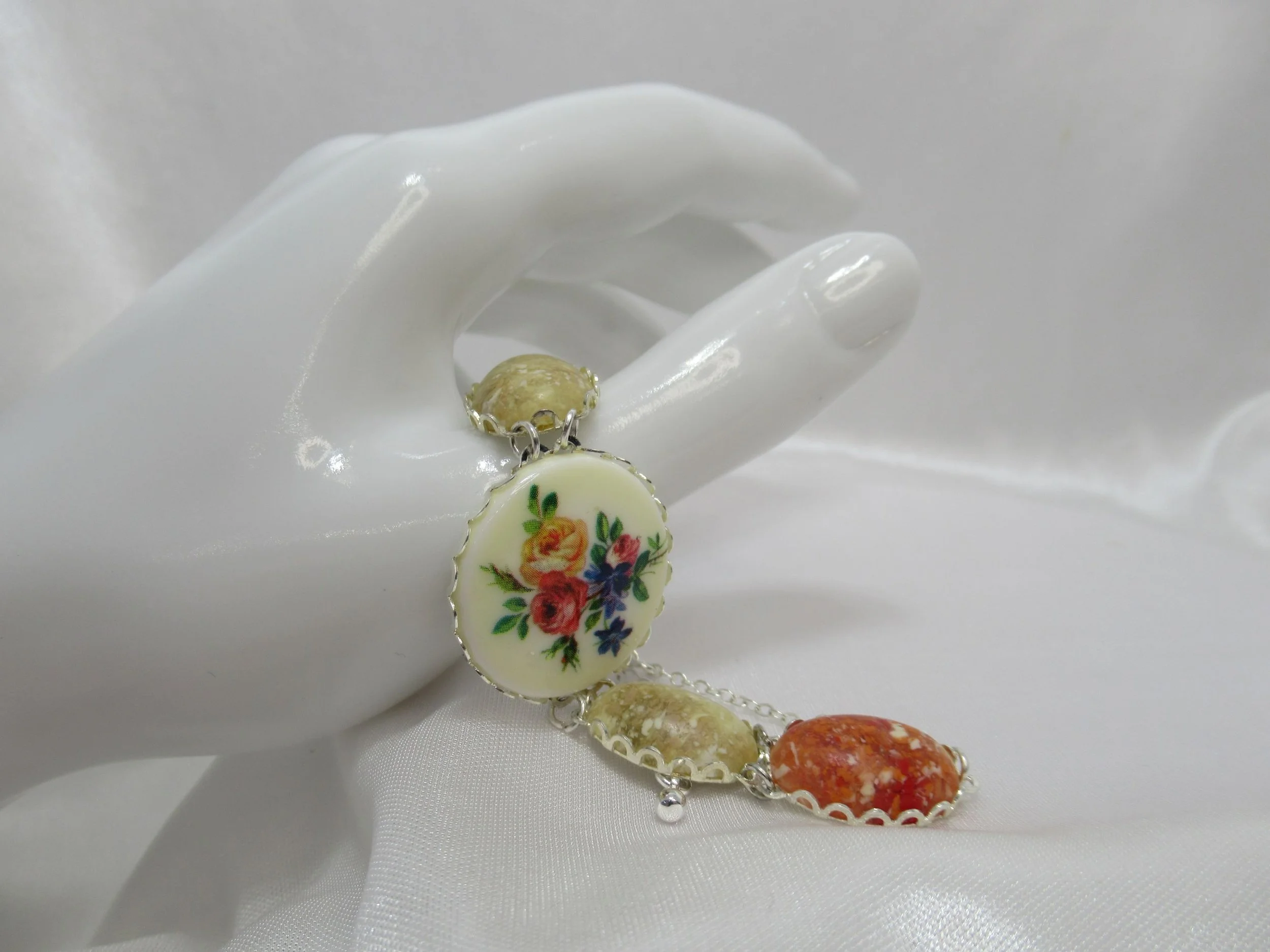 Handcrafted Turkish Silver Plated Sunflower Bracelet Cuff 1950s Limoge Red Rose Cabochon Old New