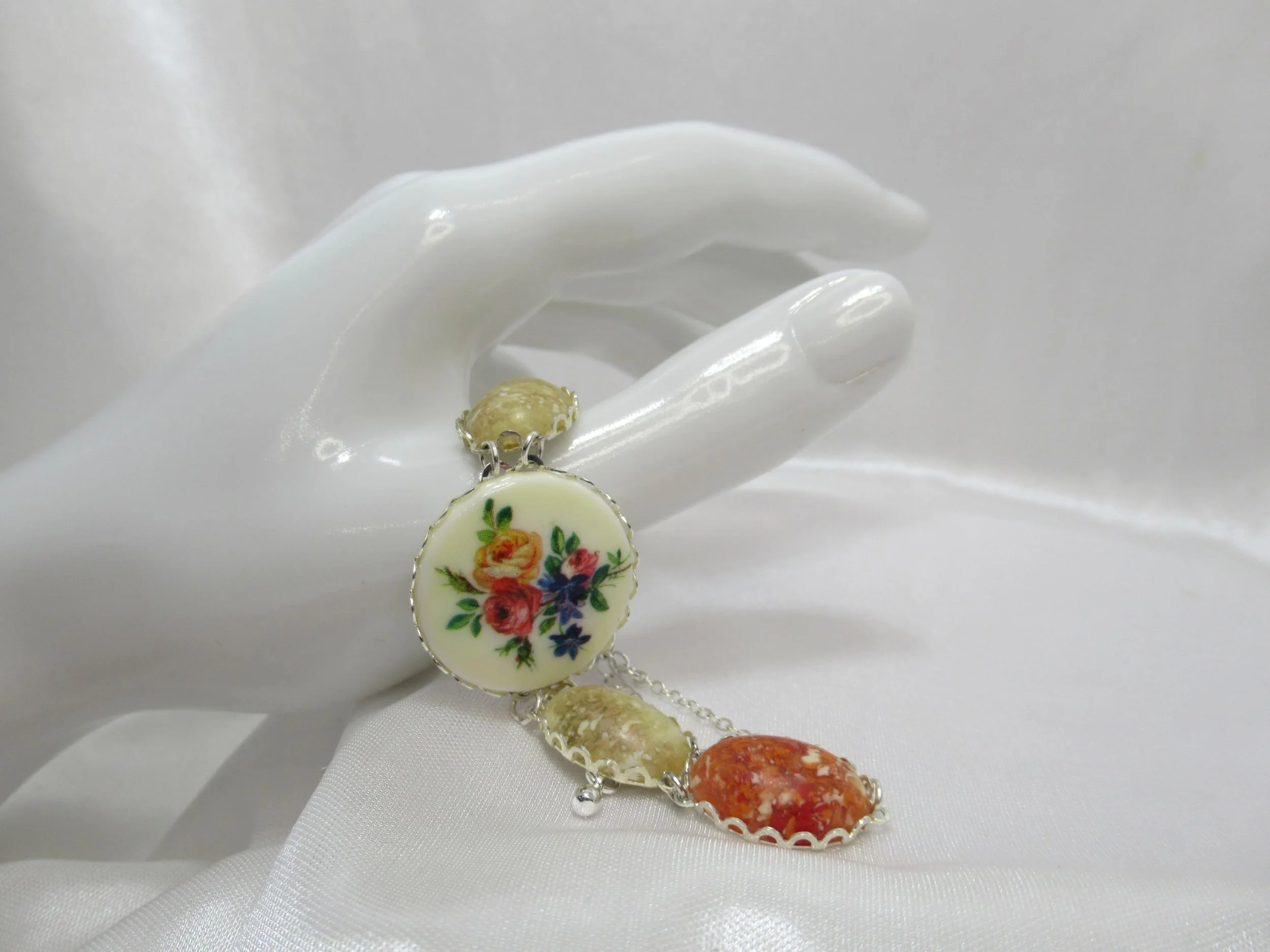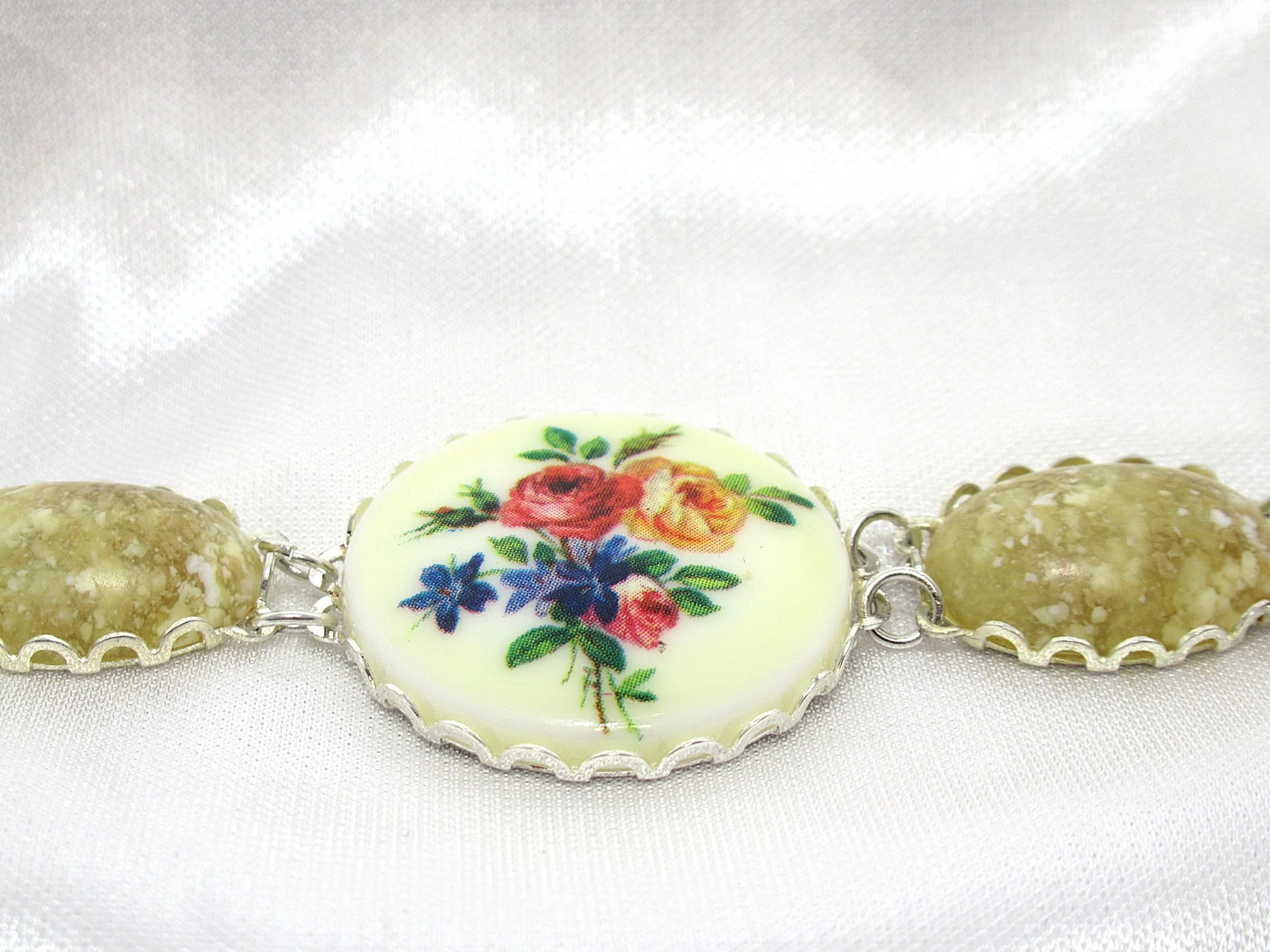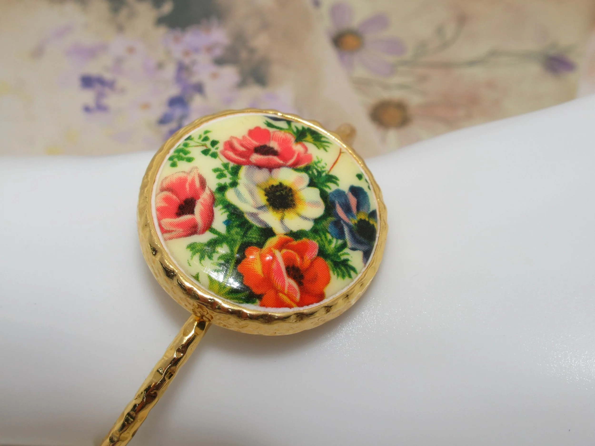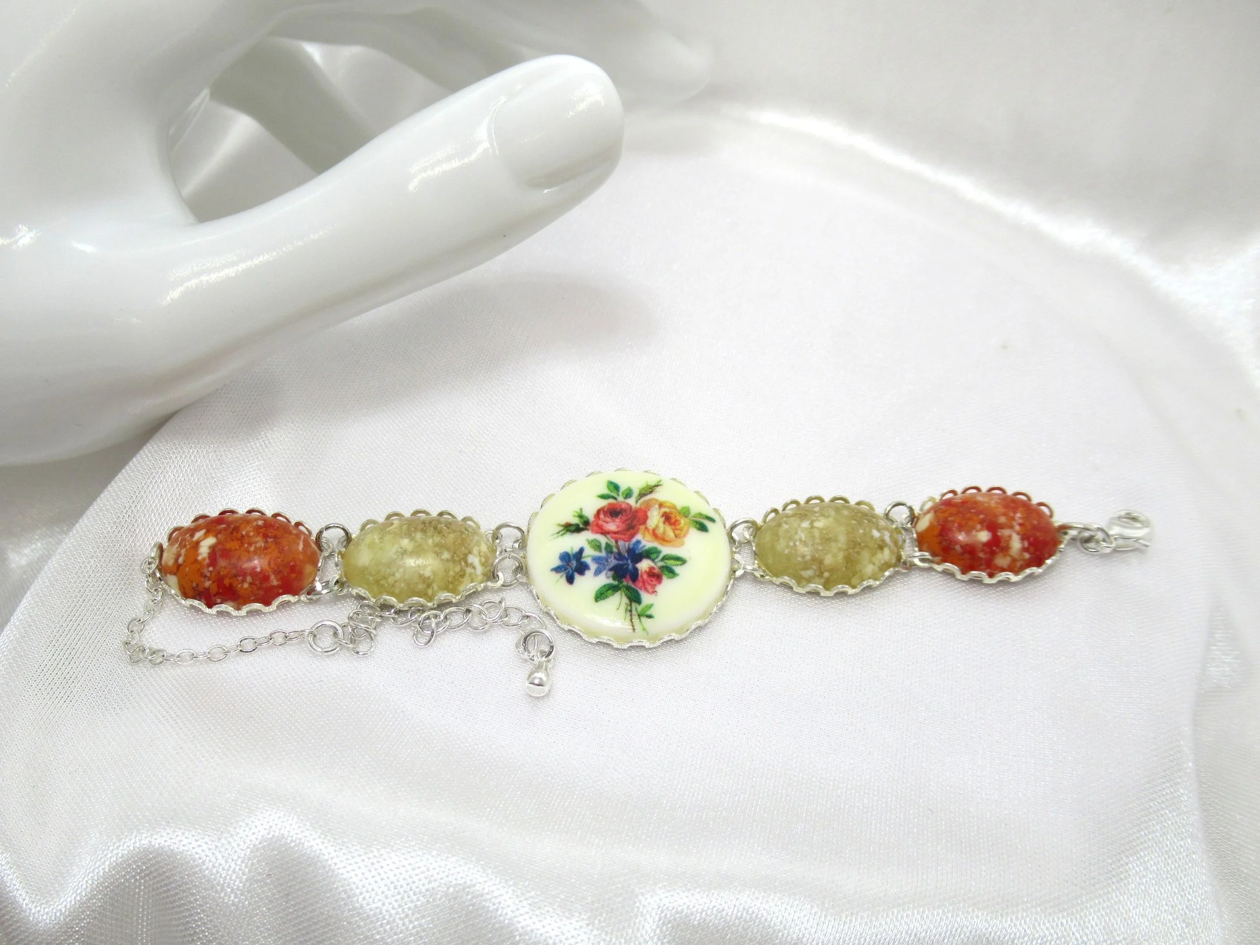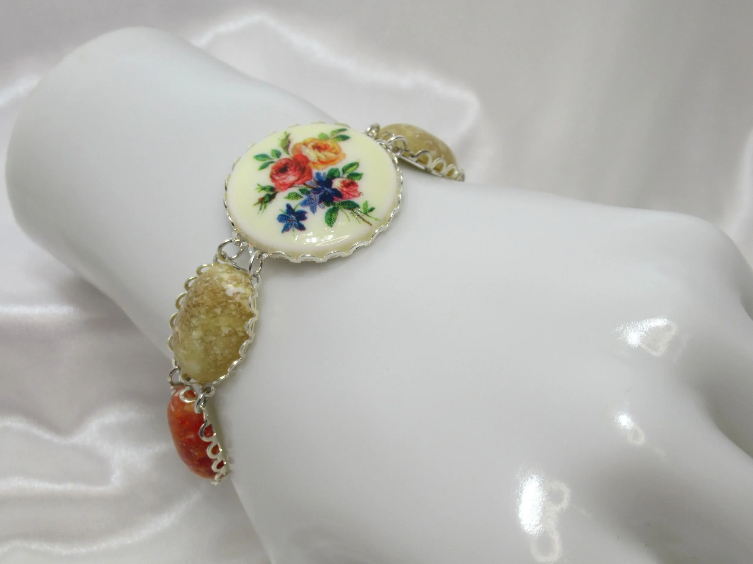 Handcrafted Turkish Silver Plated Sunflower Bracelet Cuff 1950s Limoge Red Rose Cabochon Old New