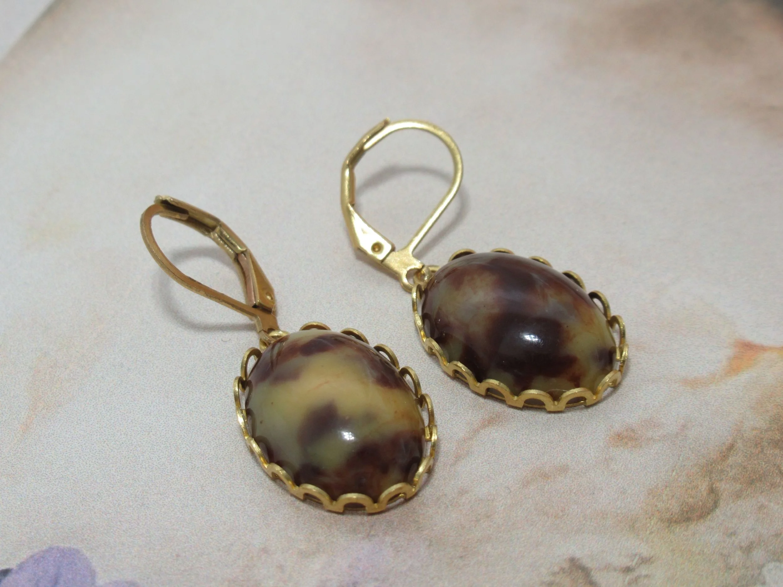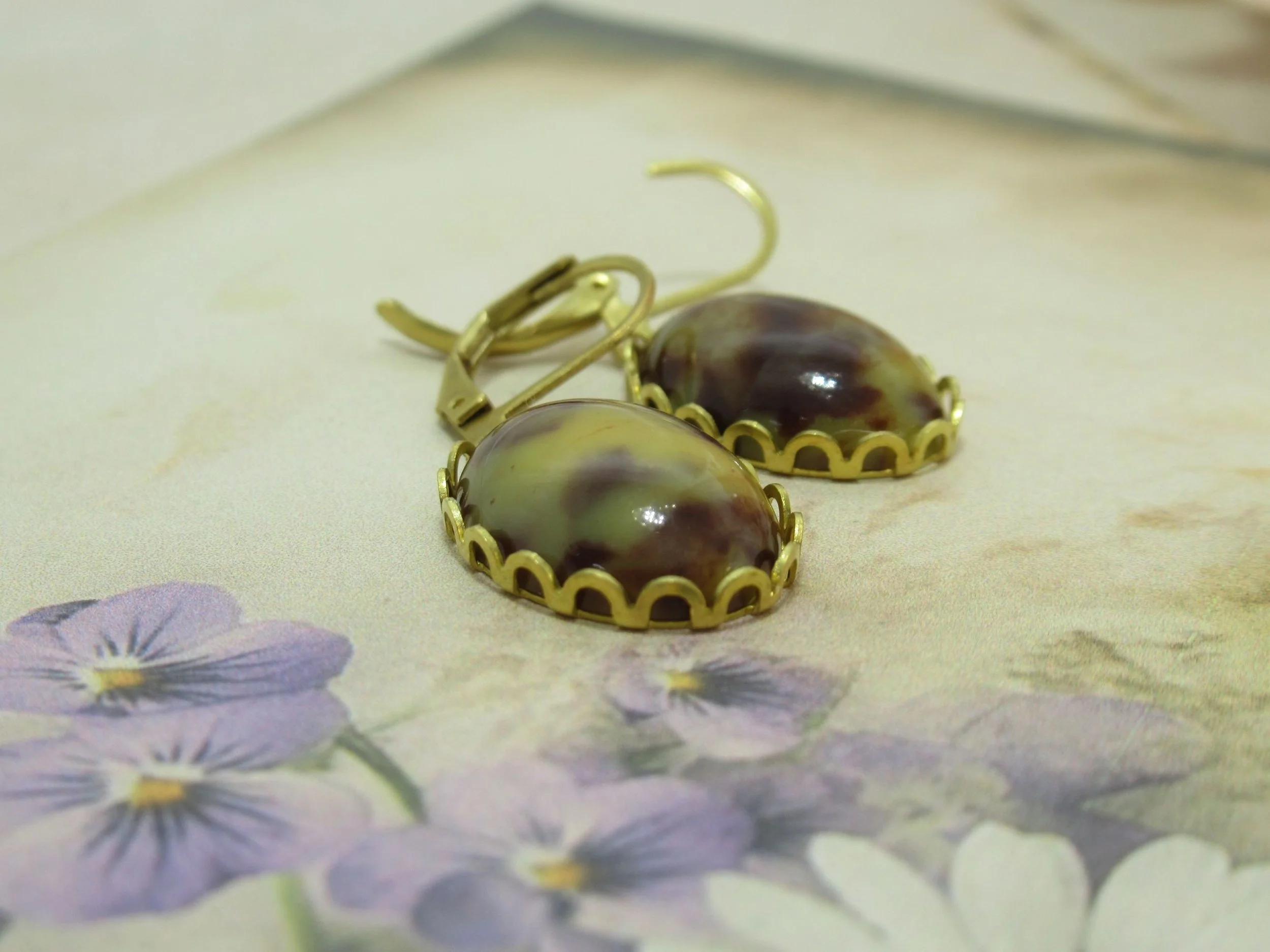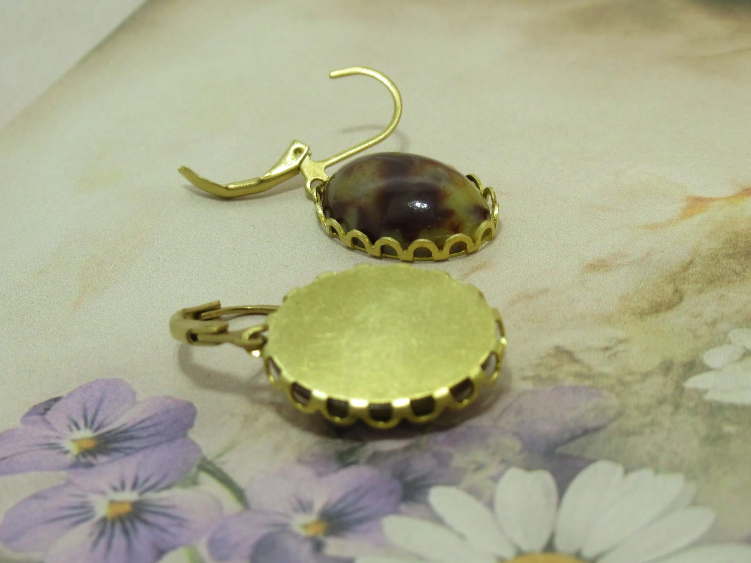 The earrings are new and unused, with brass stampings and vintage glass stone cabochons.
