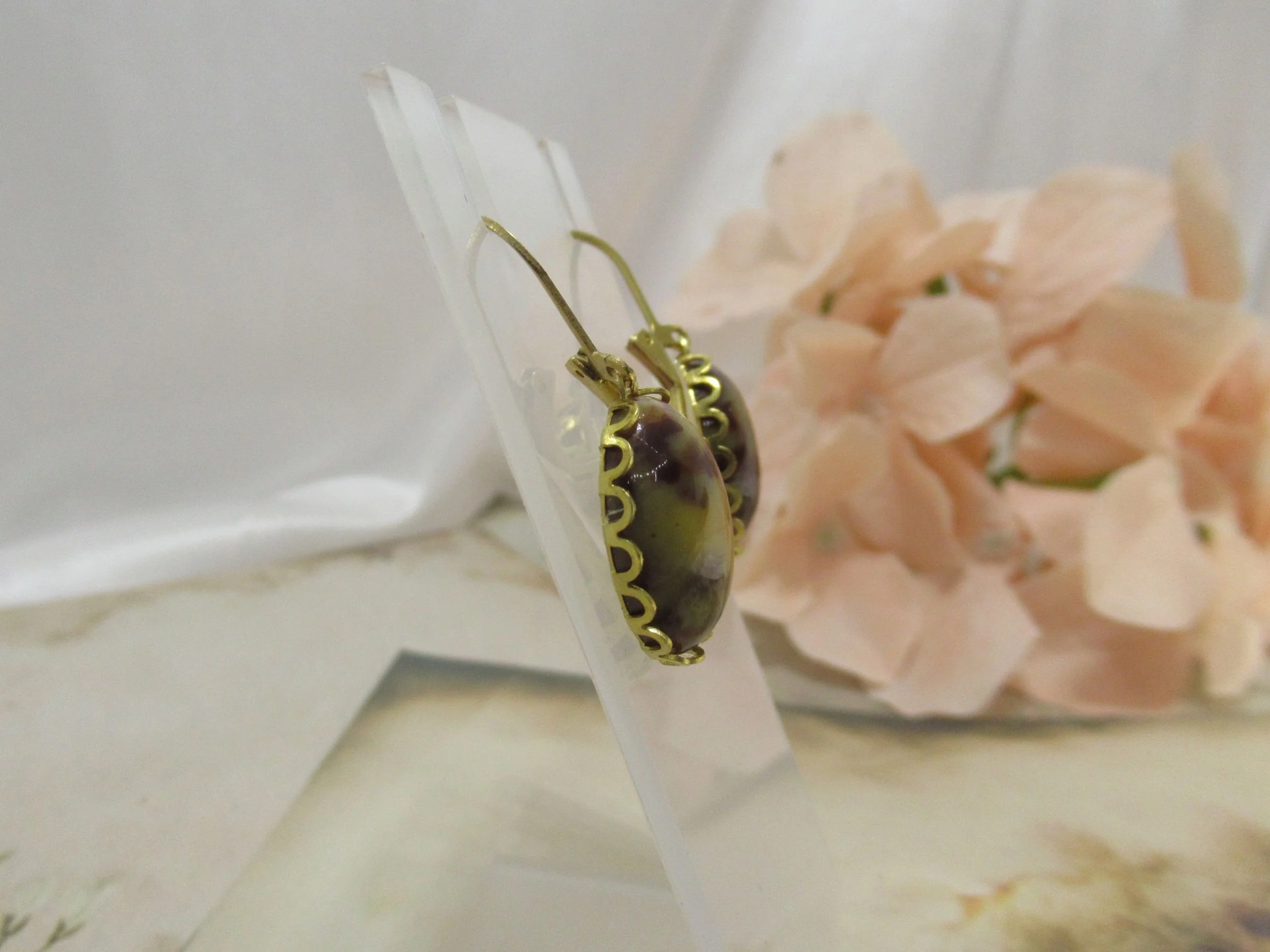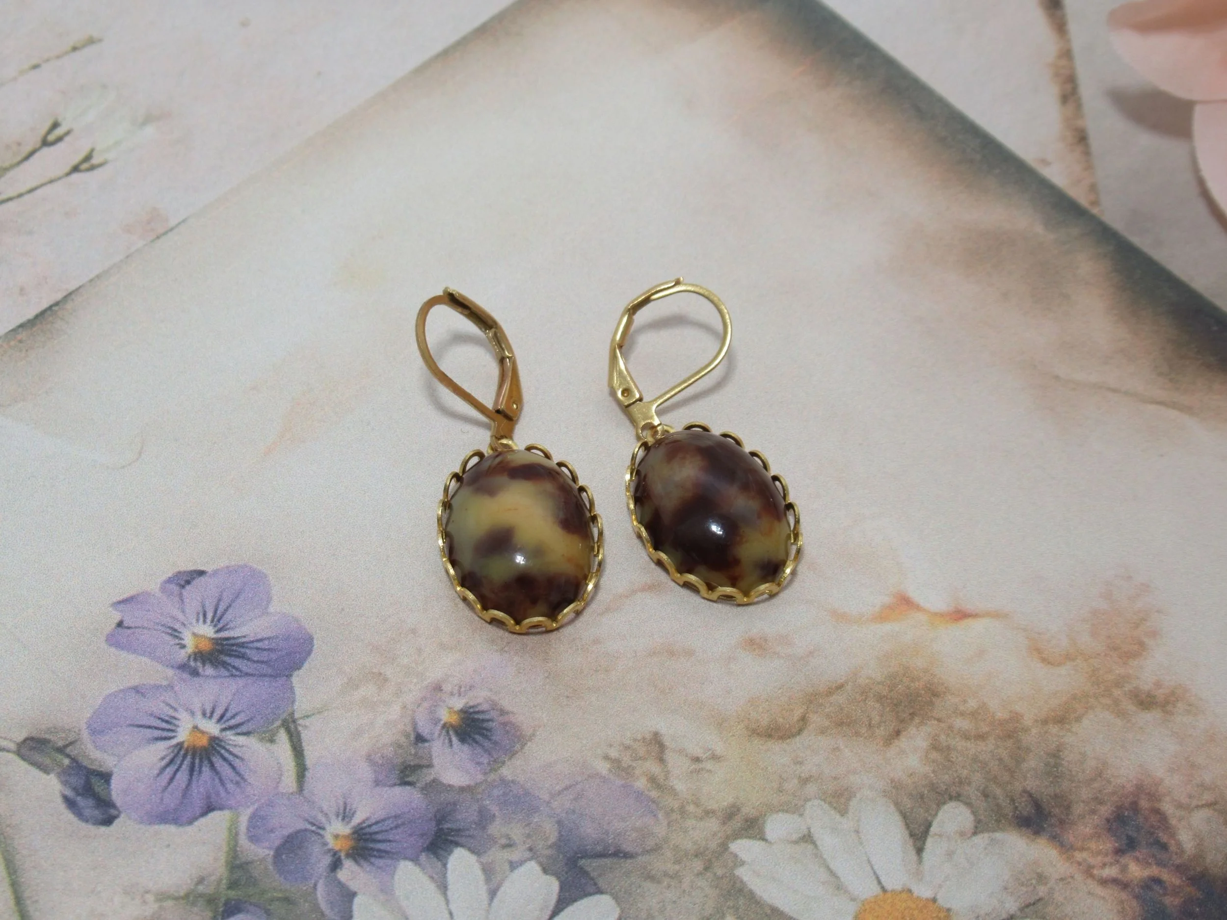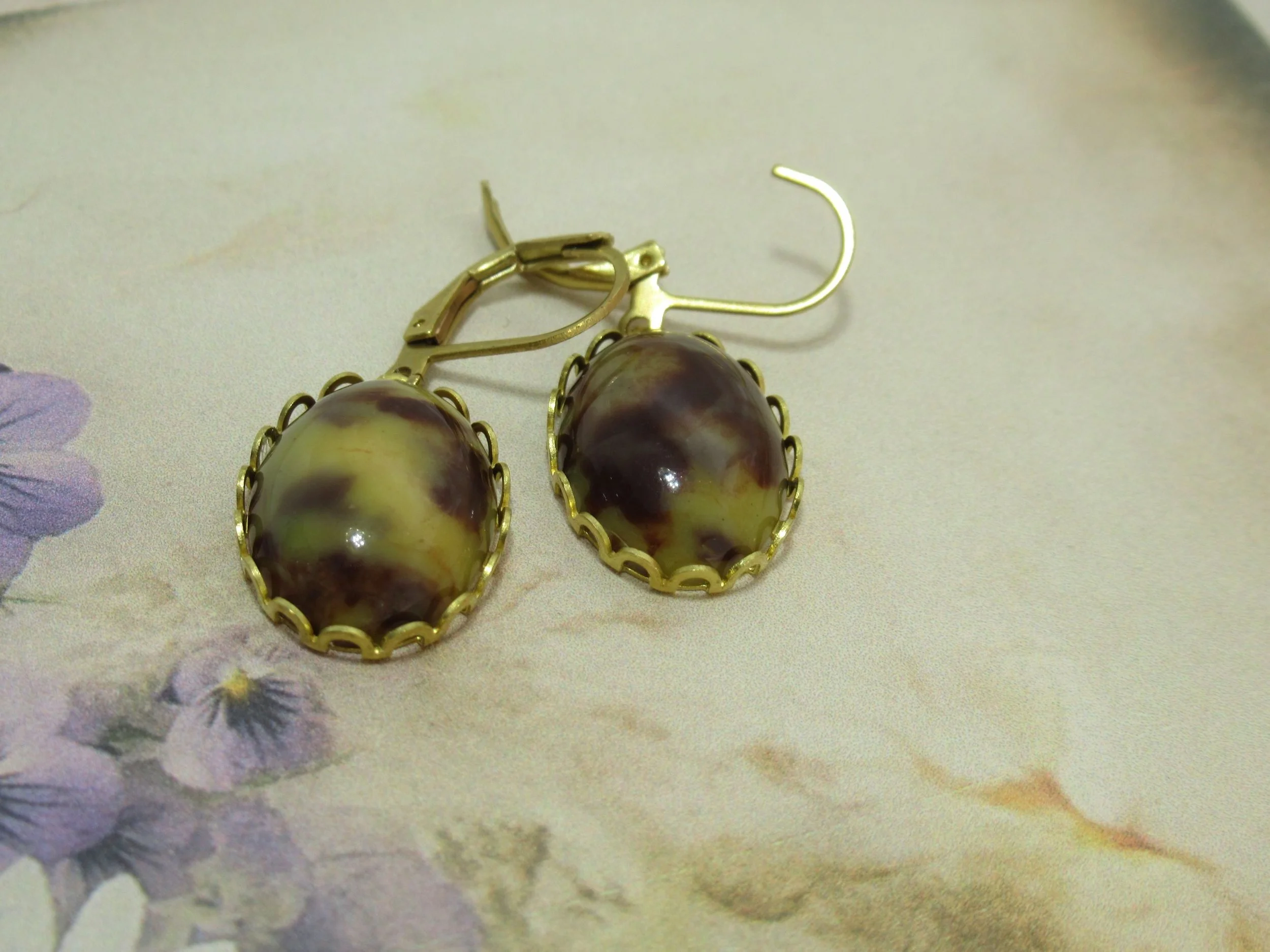 The earrings are new and unused, with brass stampings and vintage glass stone cabochons.