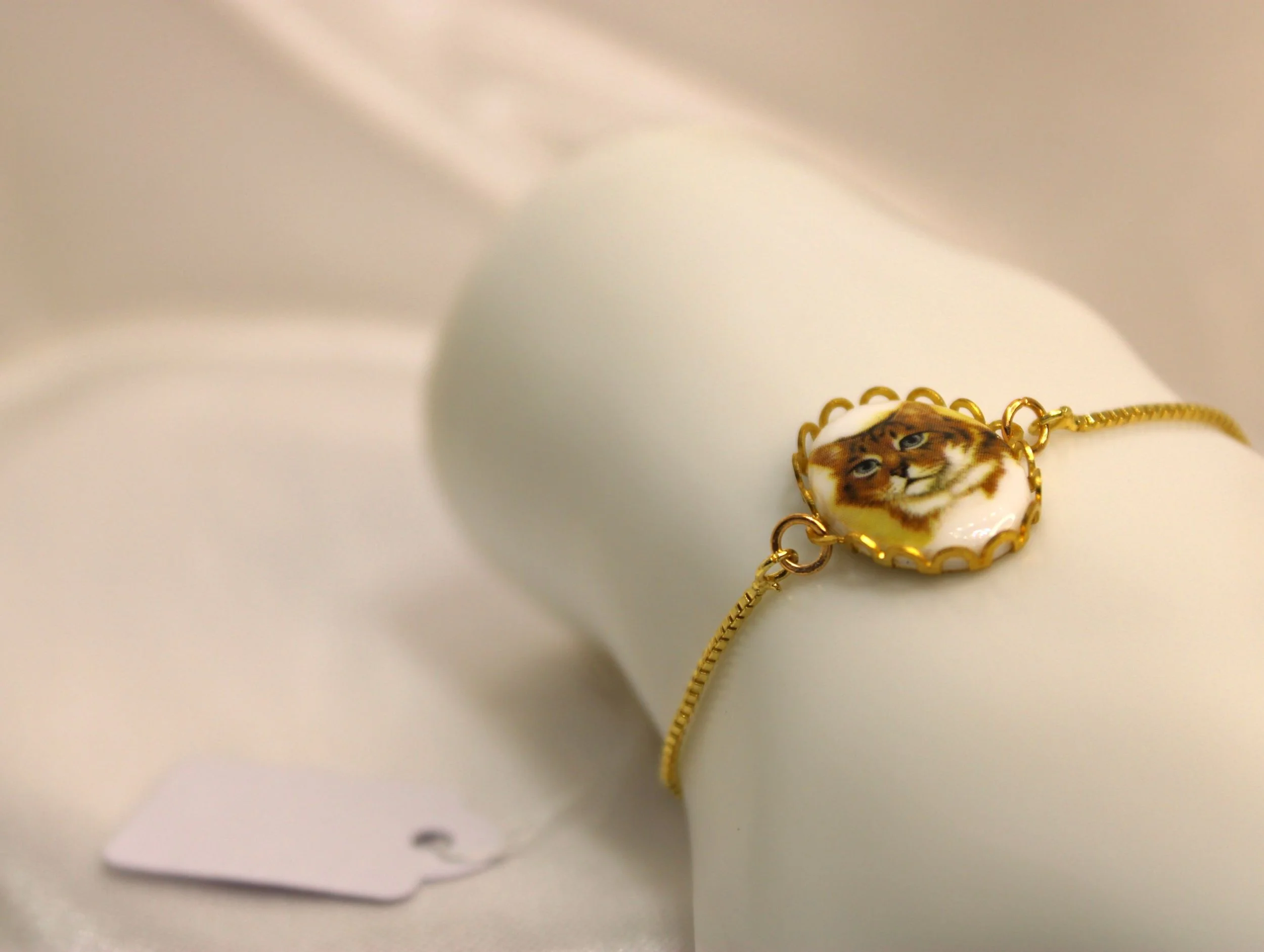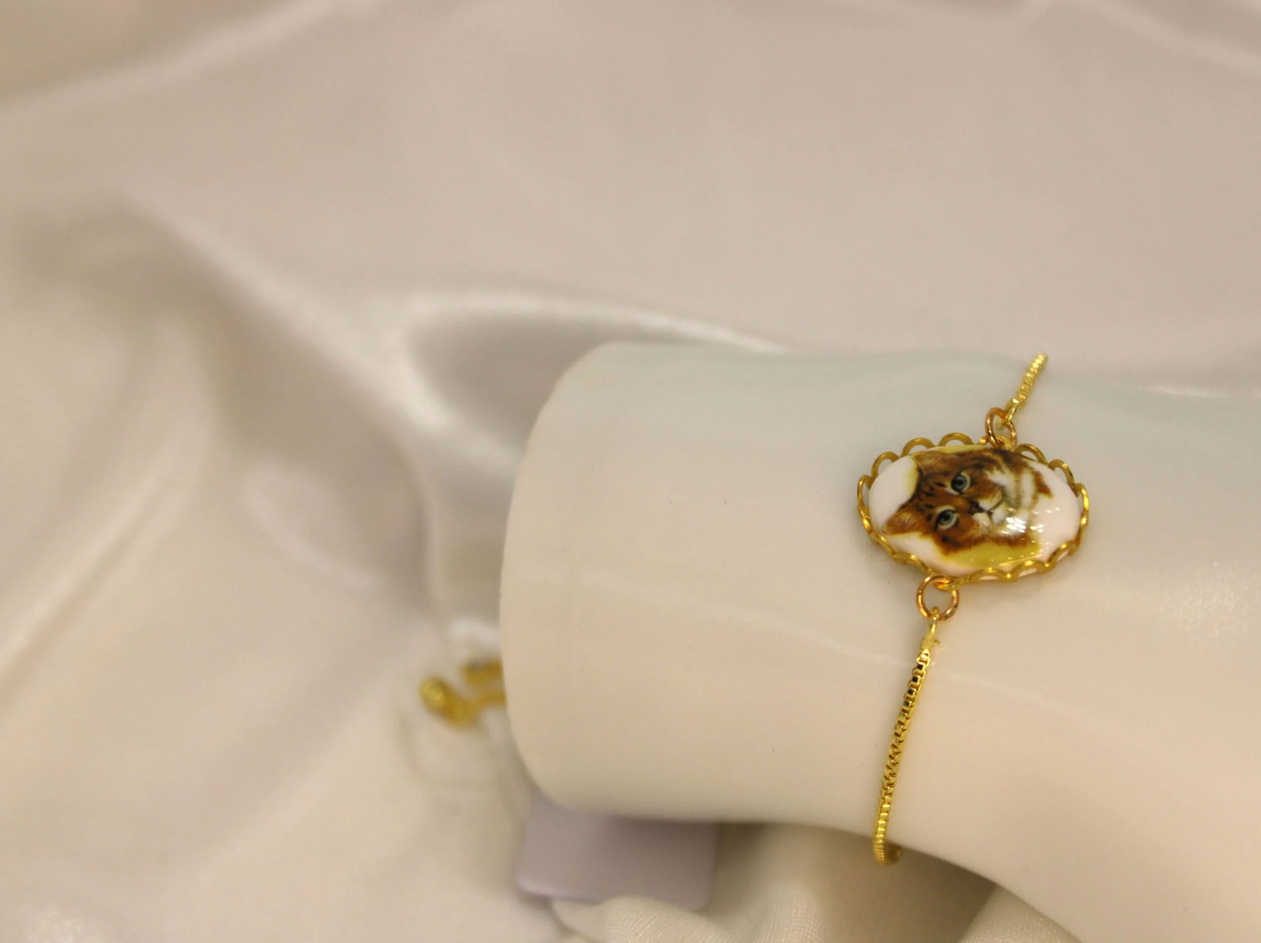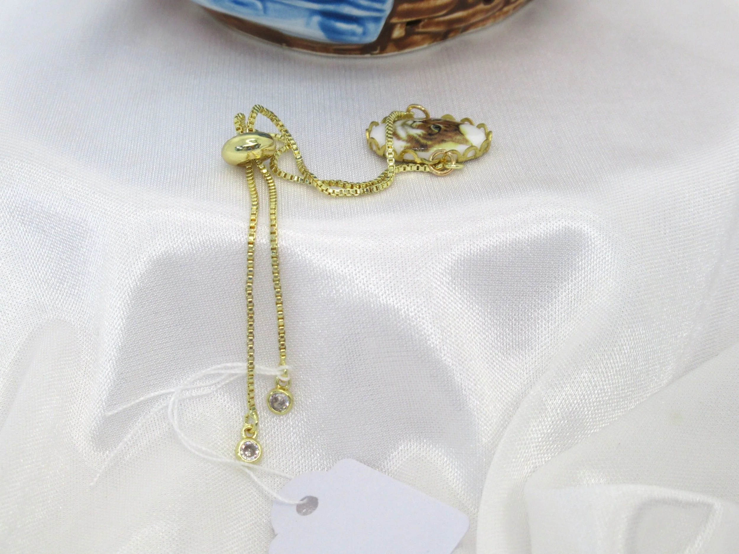 Beautiful upcycled gold-toned slider bracelet featuring a vintage mid-century West German oval glass cameo cabochon. Colourful and bright, and with attention to detail, this dainty bracelet features a raised white butterfly pattern on a pretty pastel green finish. The cabochon is set in a beautifully decorative gold-toned brass bezel with a roped frame and is attached to an adjustable slider bracelet. The bracelet is made of a gold-toned copper alloy and features two decorative diamantes at each end, along with a secure rubber stopper.