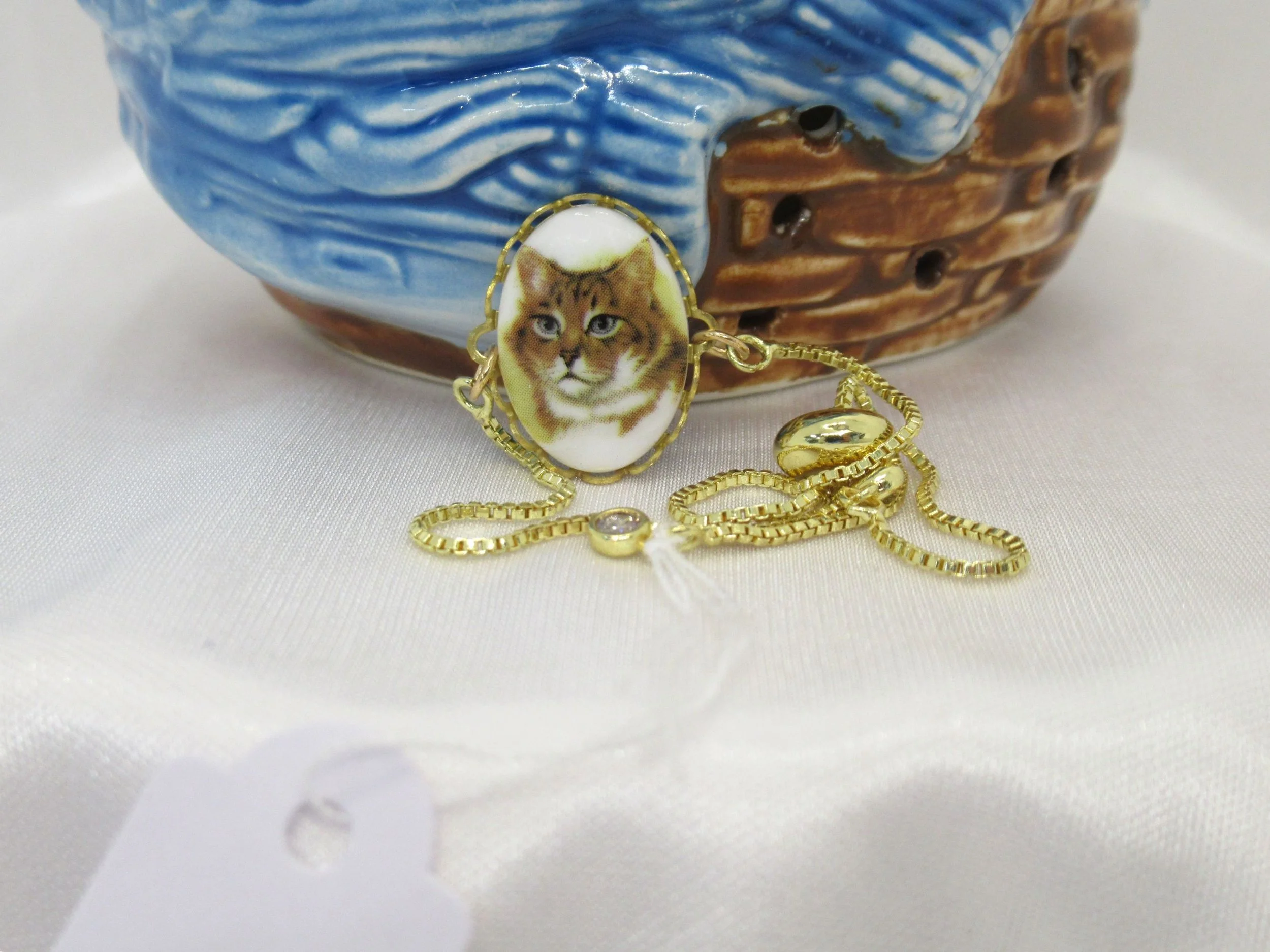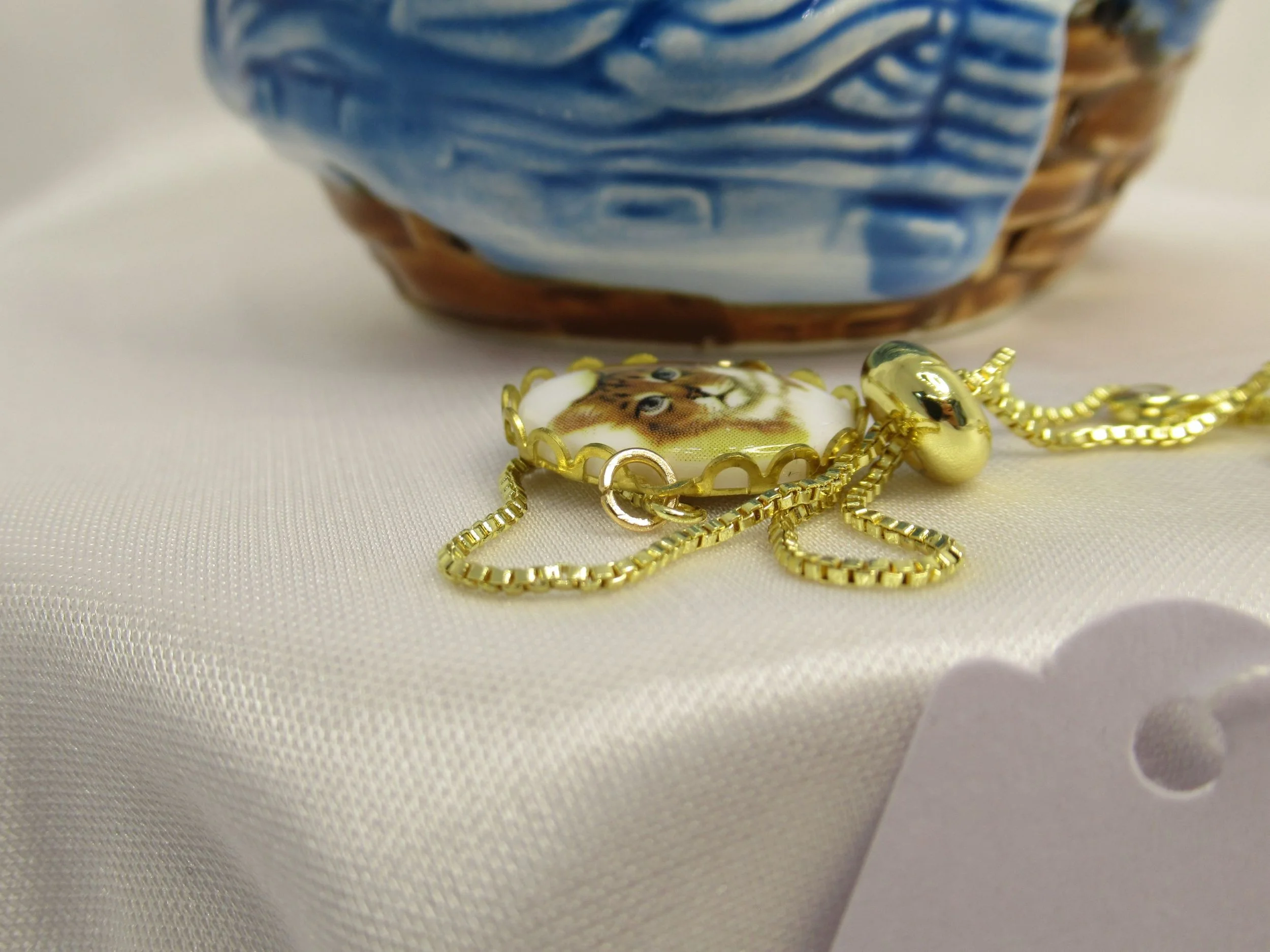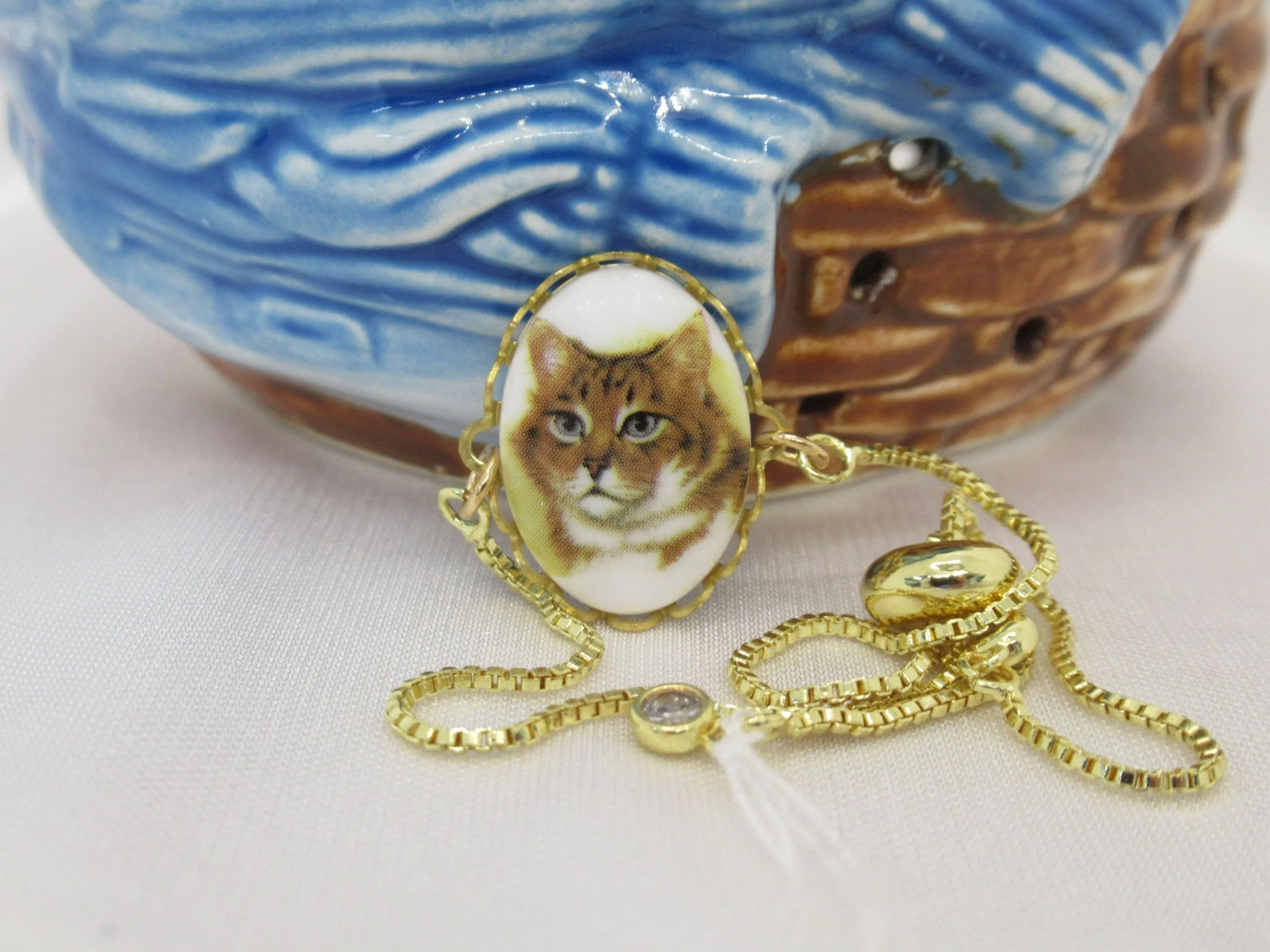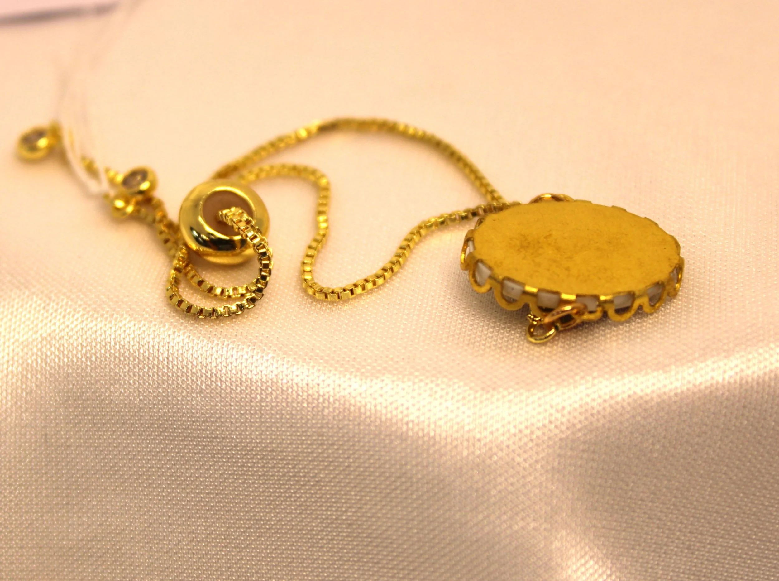 Beautiful upcycled gold-toned slider bracelet featuring a vintage mid-century West German oval glass cameo cabochon. Colourful and bright, and with attention to detail, this dainty bracelet features a raised white butterfly pattern on a pretty pastel green finish. The cabochon is set in a beautifully decorative gold-toned brass bezel with a roped frame and is attached to an adjustable slider bracelet. The bracelet is made of a gold-toned copper alloy and features two decorative diamantes at each end, along with a secure rubber stopper.
