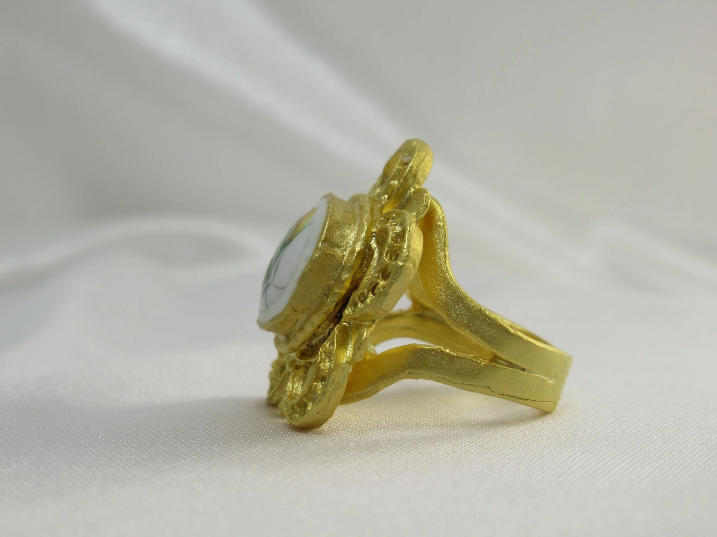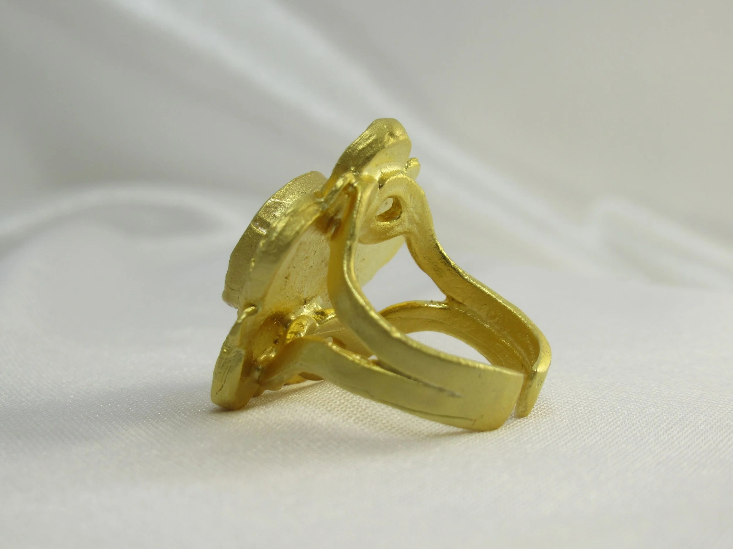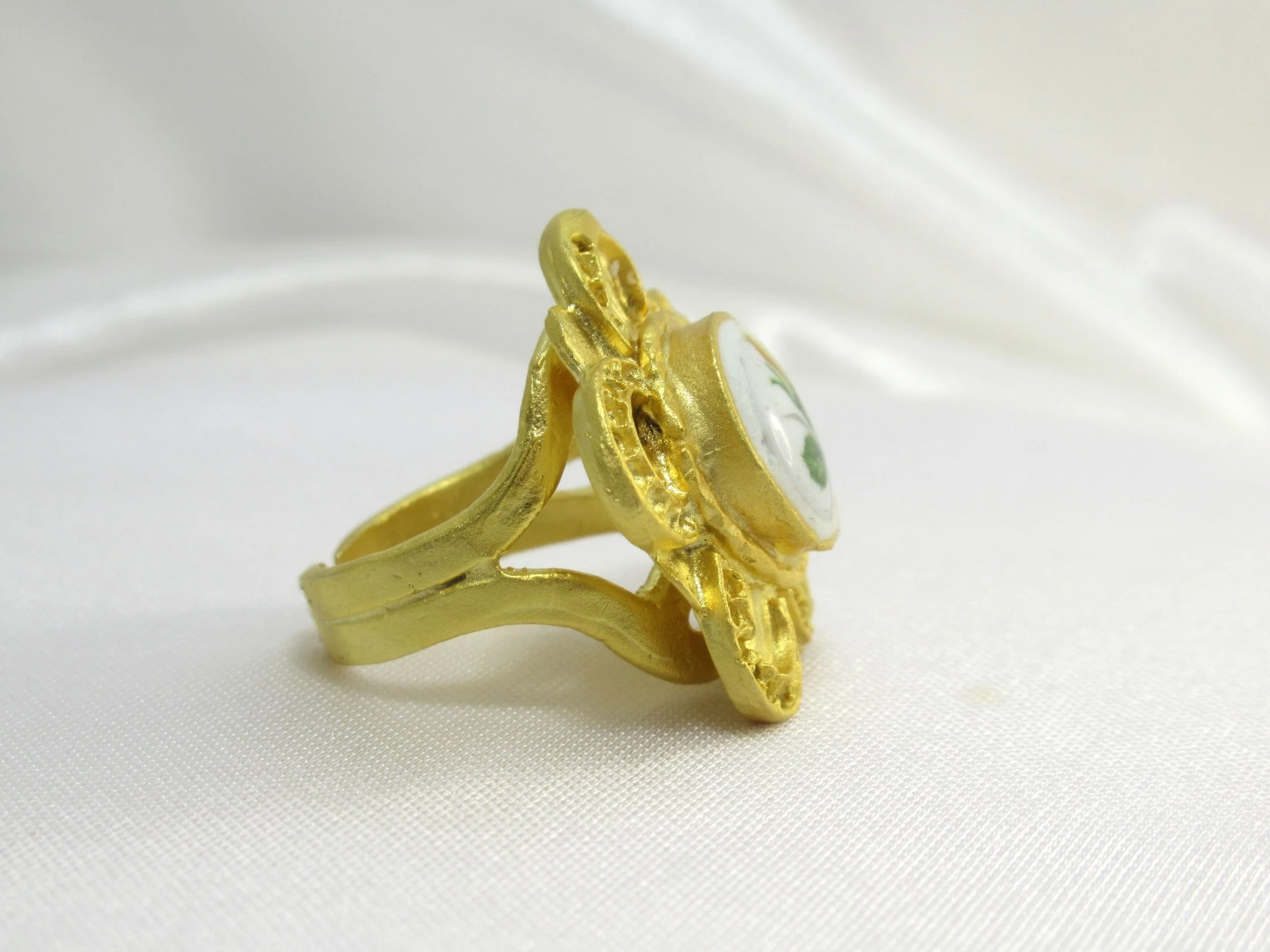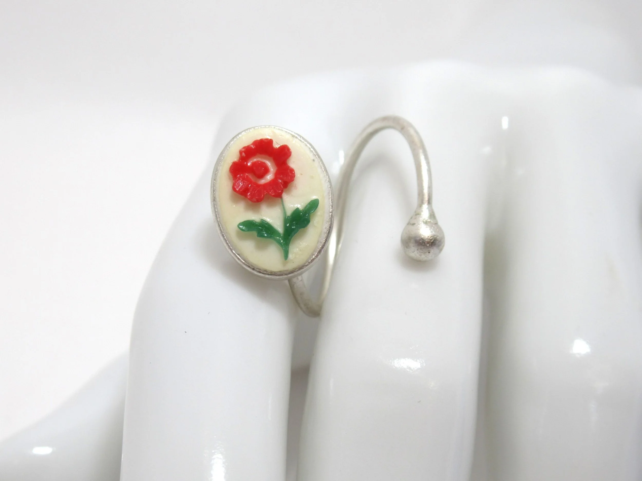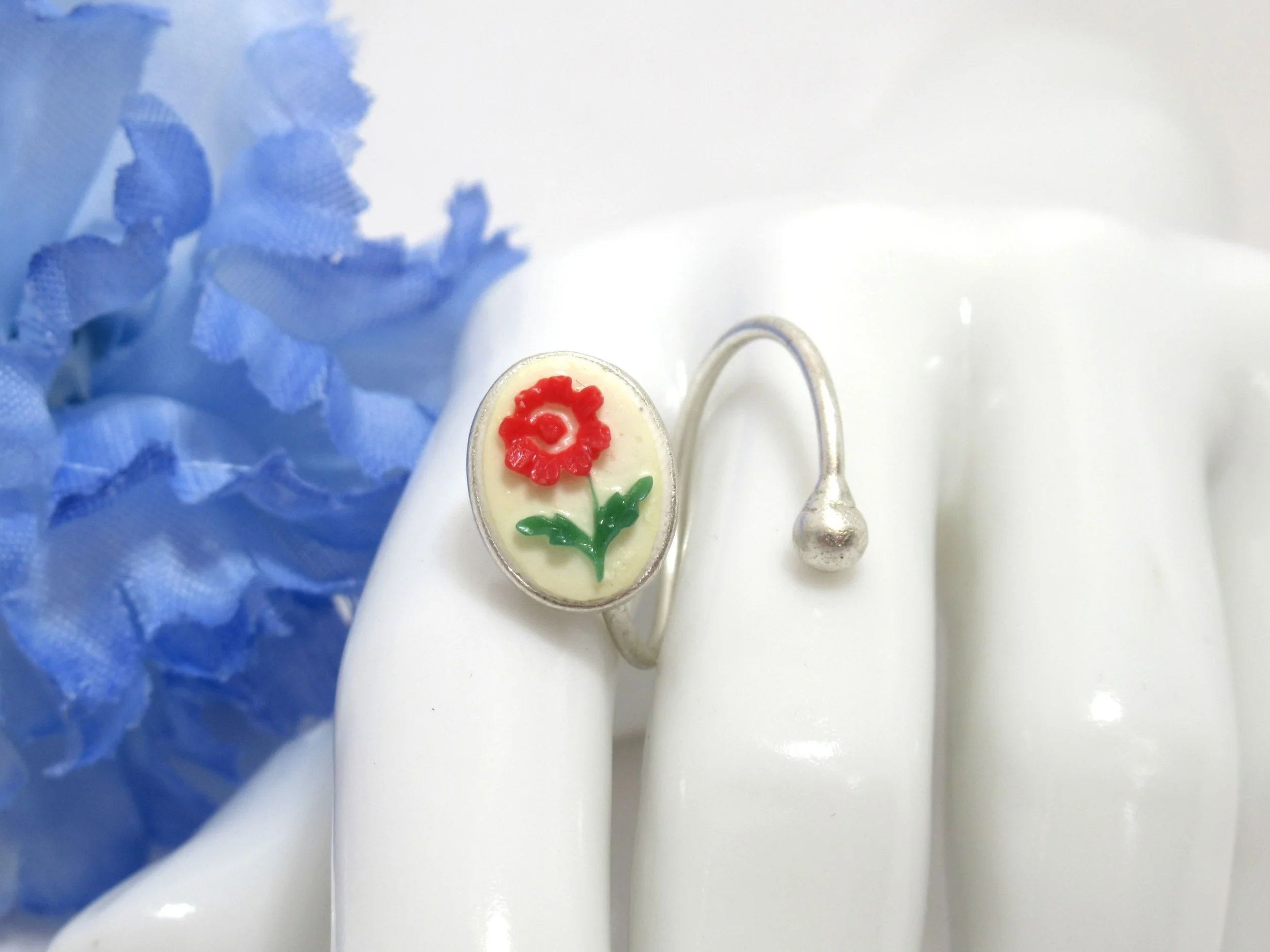 These unique, adjustable, ornate rings are handmade and feature a vintage 1970s acrylic resin oval cameo cabochon set in Turkish silver. The cameos display a raised flower pattern on a white dome base and are encased in a bezel crafted from a high-quality, silver-plated alloy that is lead and nickel-free. The silver, sourced from Turkey, boasts a stunning antiqued oxidised brass finish and showcases an oval design with a decorative hammered pattern. The rings are approximately a U.S. size 7 1/2 but can be adjusted to fit most finger sizes. You can choose between two beautiful designs: a delicate pink flower or a charming yellow flower.
