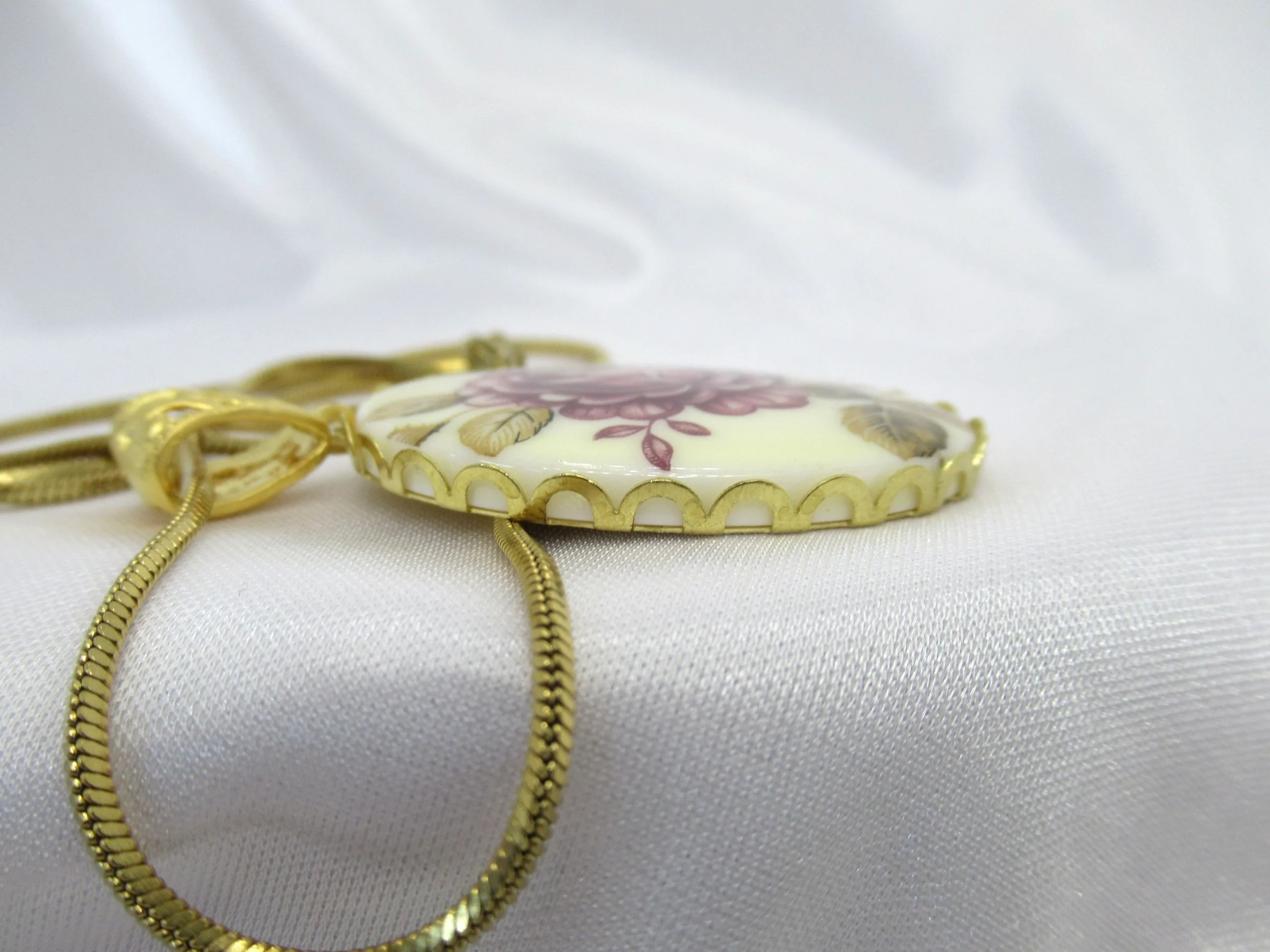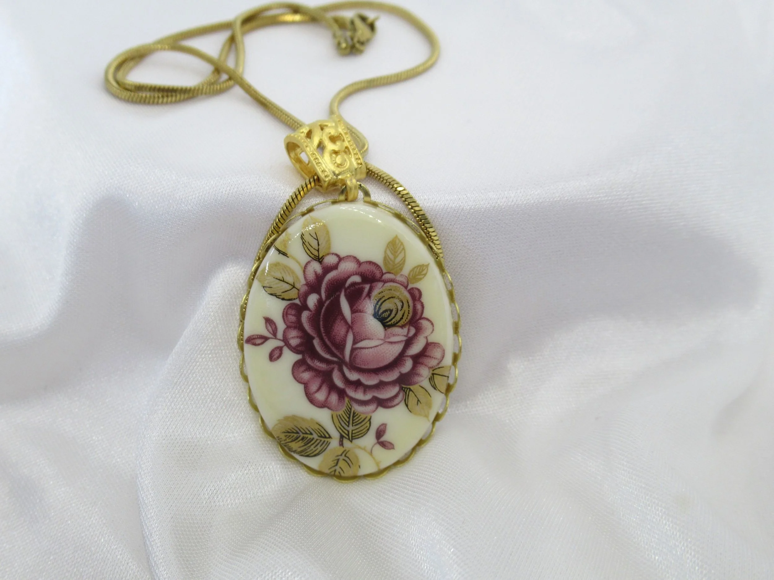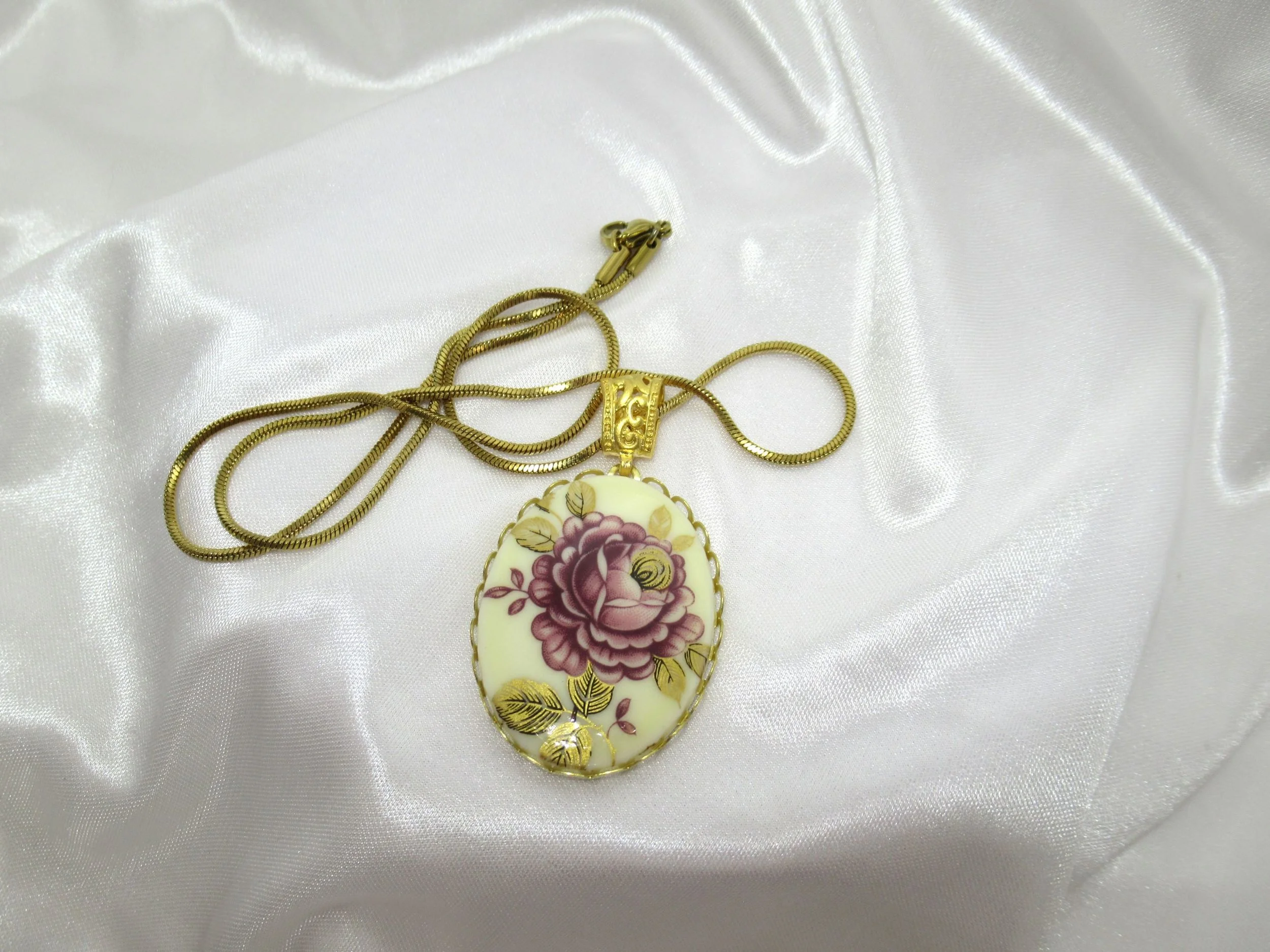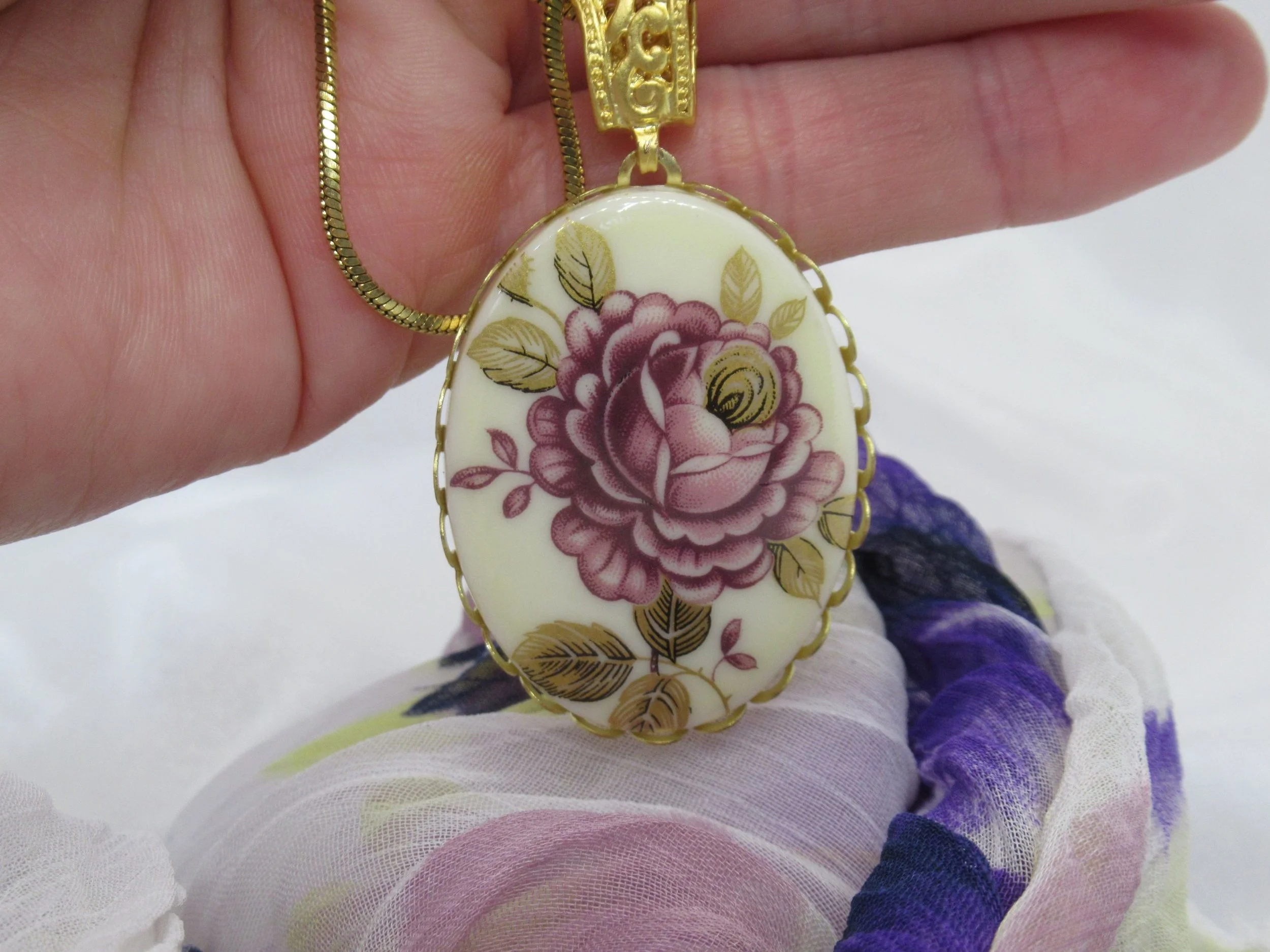 These unique, ornate pendant necklaces are handmade and embody a charming, ethnic boho style. Each necklace features a vintage 1950s round glass Limoges/porcelain cabochon set in a high-quality, lead- and nickel-free silver-plated brass alloy bezel mounting, with a lovely round, decorative, hammered design. The silver, sourced from Turkey, has a beautiful antiqued oxidised finish, while the cabochons are from Japan. You can choose between two lovely designs: a pretty red rose flower bouquet or a delicate yellow rose bud. Each necklace is paired with a complementary, new 56 cm 925 silver link chain that includes a lobster clasp closure.