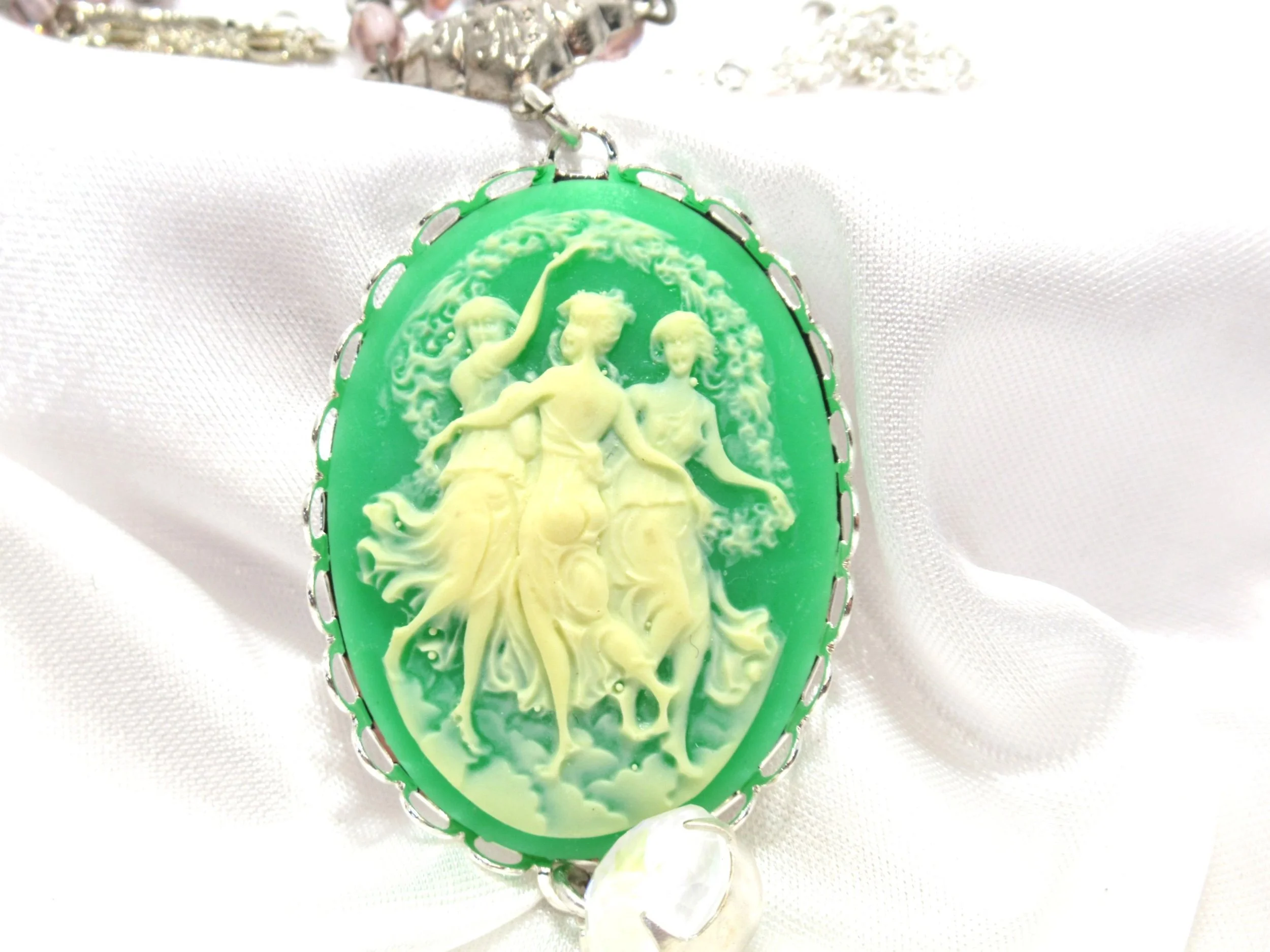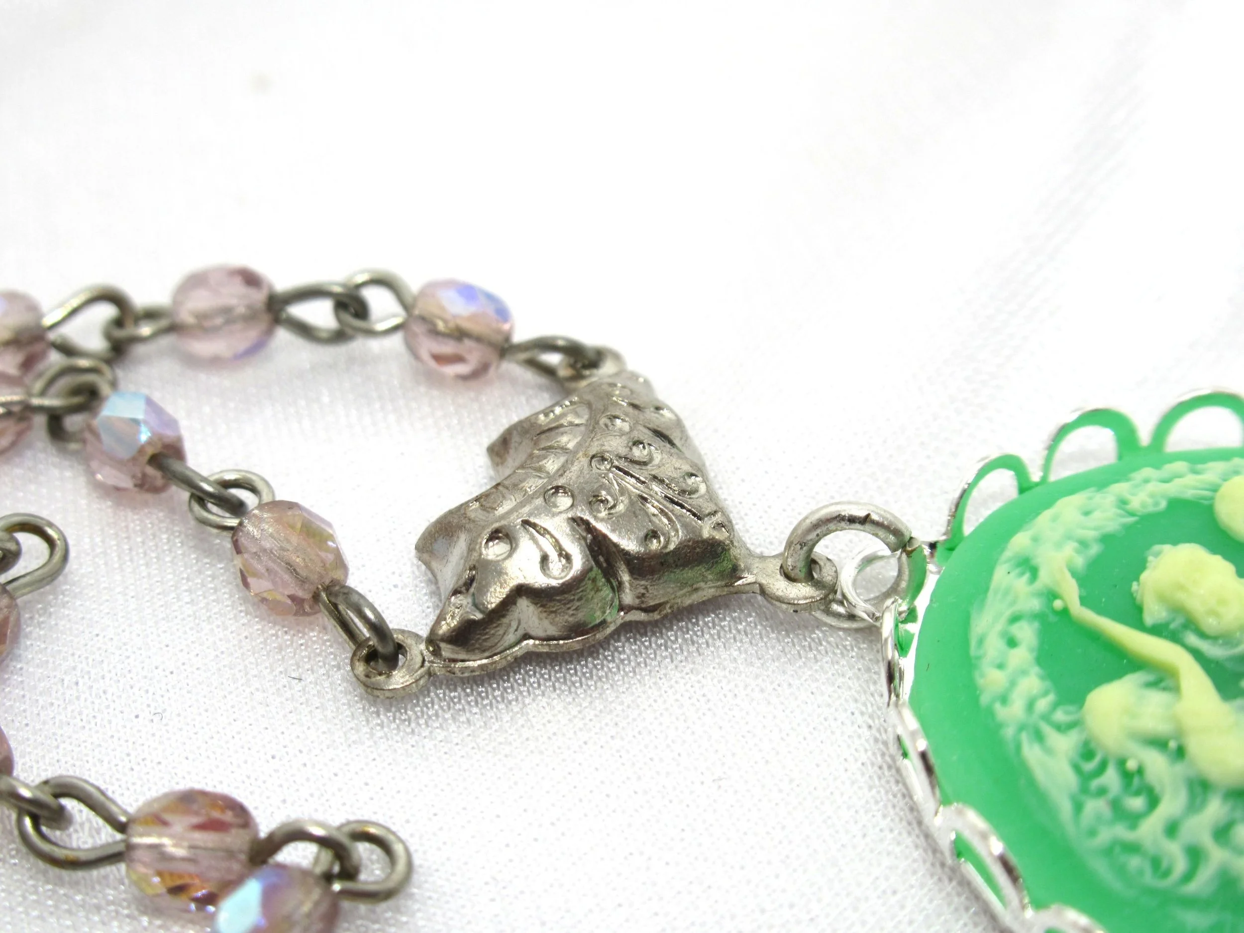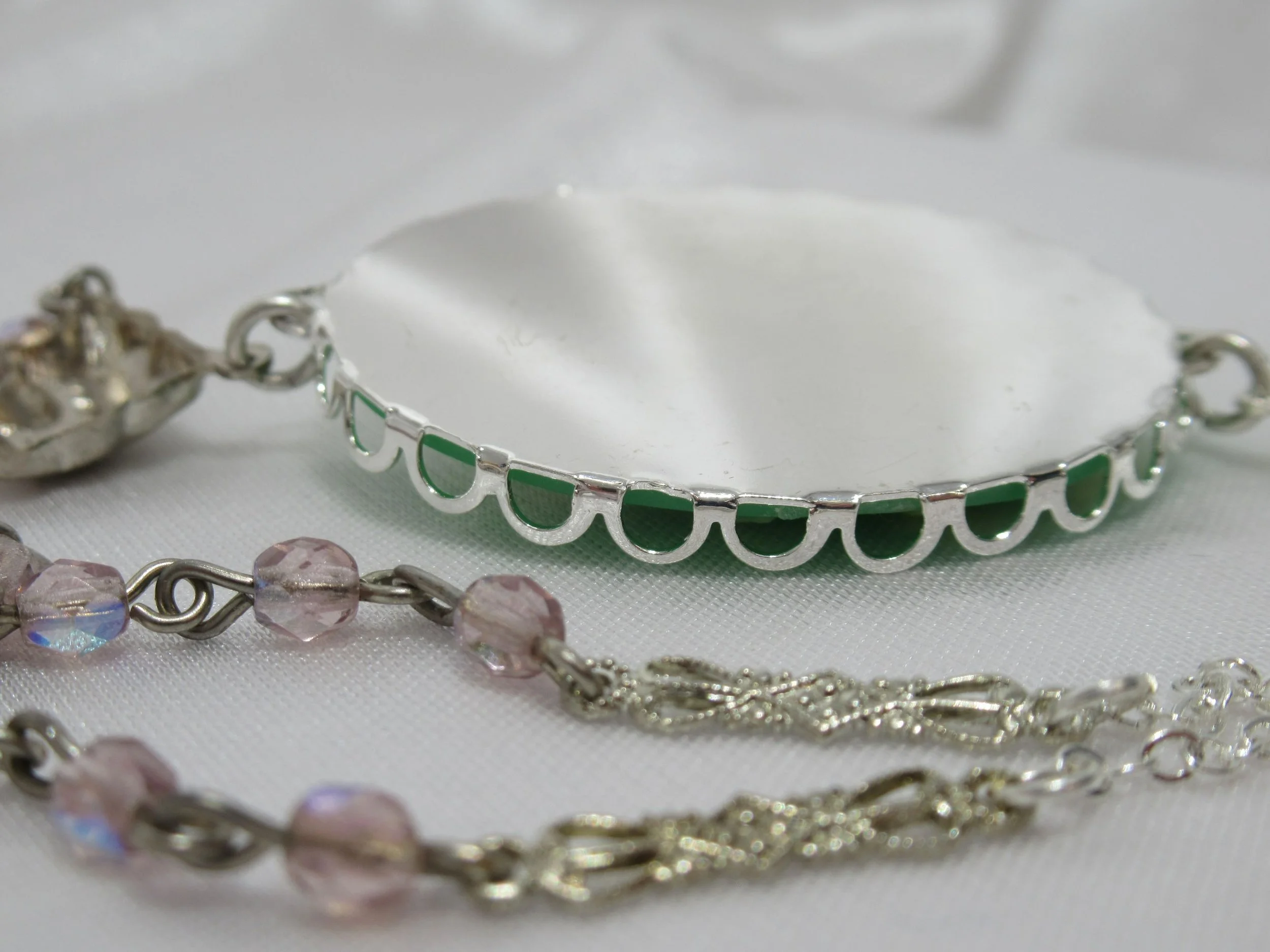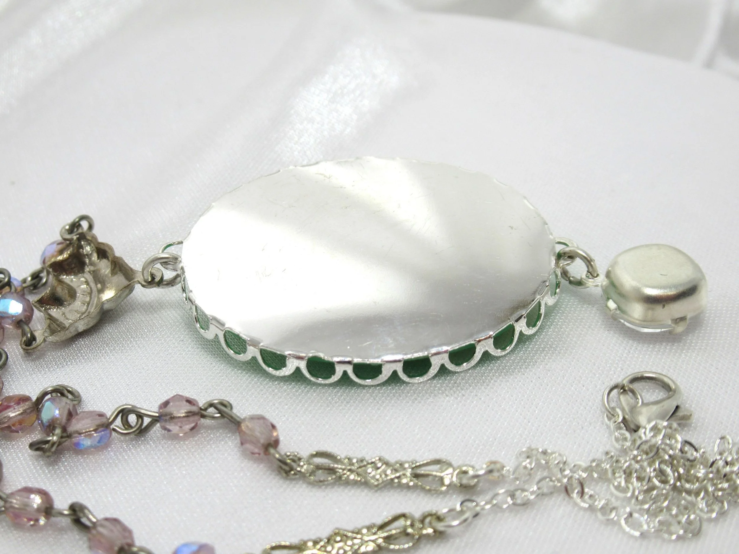 This stunning pendant necklace features a gorgeous vintage 1950s pink Quartz glass cabochon from the Cherry brand in Japan, beautifully set in a handcrafted Turkish silver-plated pendant. The quartz glass cabochon boasts a lovely pink rose hue with an etched Egyptian scarab hieroglyphic pattern, flat back and a raised domed design. It is elegantly framed within a decorative, ornate, solid silver-plated oval bezel, crafted from high-quality silver-plated alloy sourced from Turkey, complete with an antiqued oxidised finish. Additionally, the pendant includes a solid sterling silver 925 connector bail, also sourced from Turkey. The necklace comes with a complimentary 56 cm silver link chain, with a lobster clasp closure.